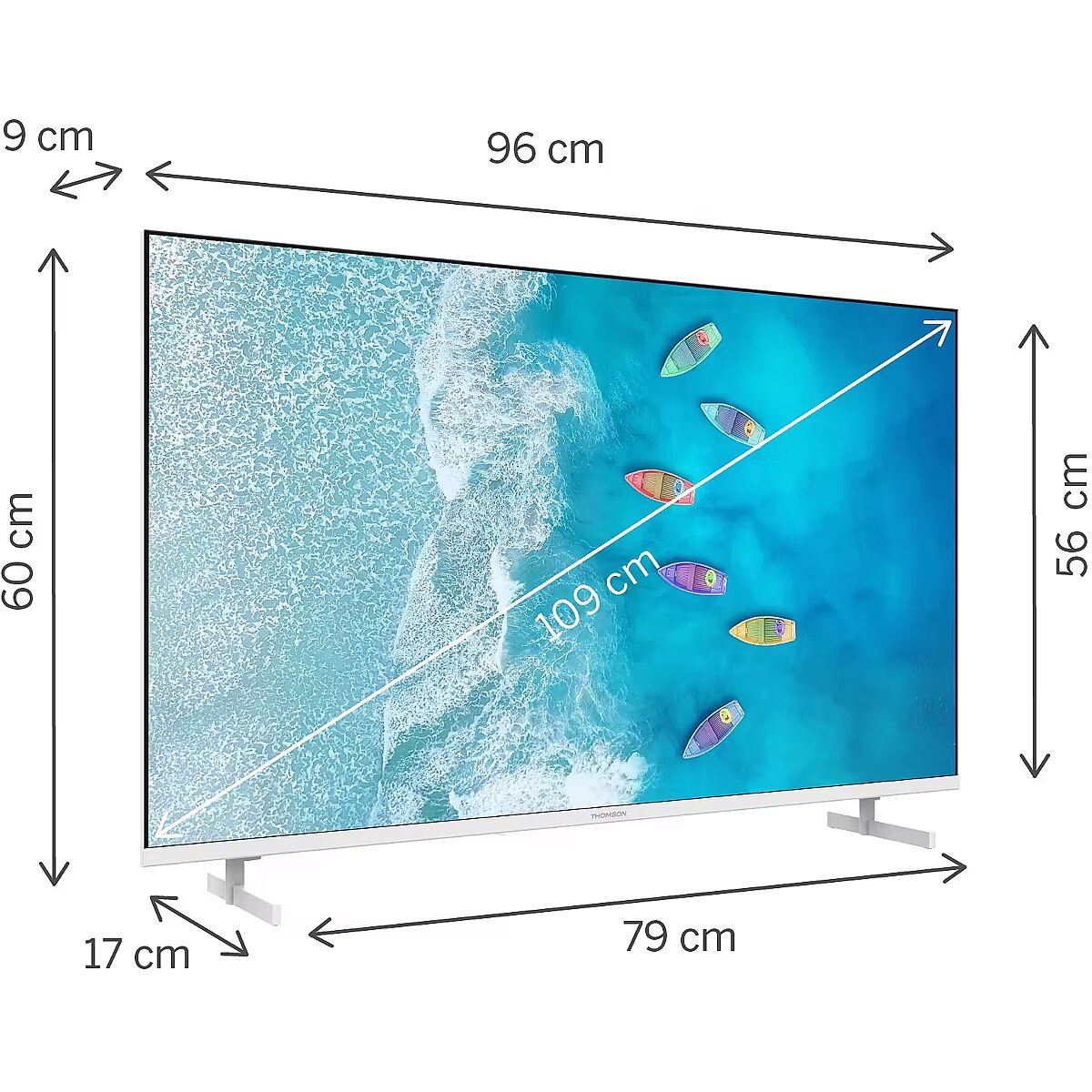 Summary - Thomson 43UG4S15. Display diagonal: 109.2 cm (43"), Display resolution: 3840 x 2160 pixels, HD type: 4K Ultra HD, Display technology: LED, Screen shape: Flat, LED backlighting type: Direct-LED. Smart TV. Native aspect ratio: 16:9. Digital signal format system: DVB-C, DVB-S, DVB-S2, DVB-T, DVB-T2. Wi-Fi, Ethernet LAN. Product colour: Black