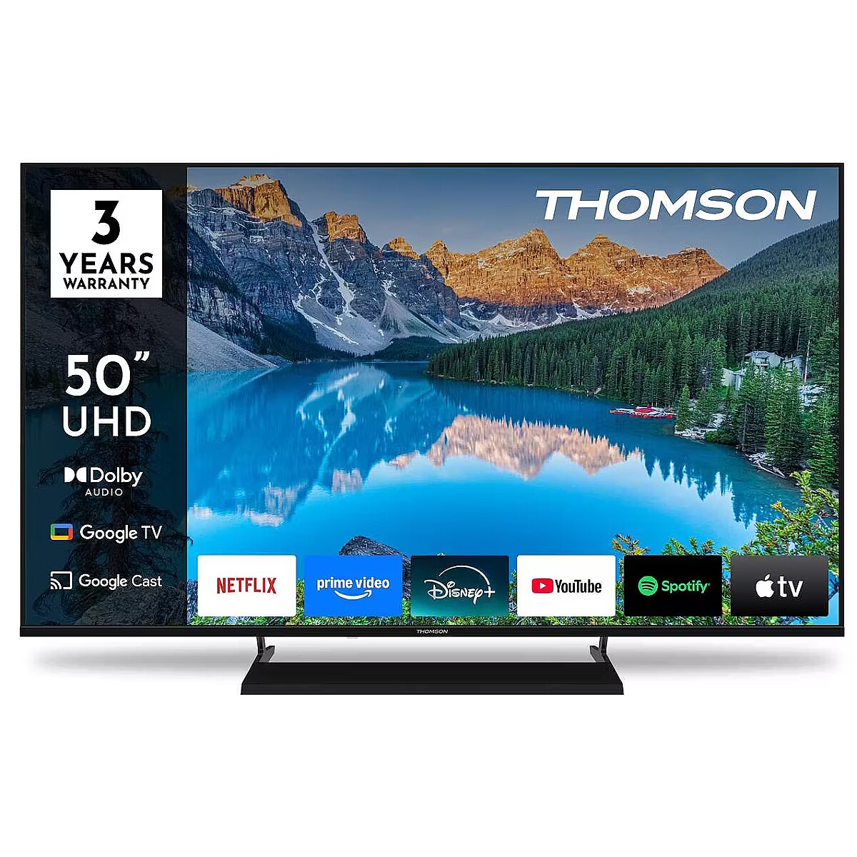 Description - Bring your favourite content to life with the Thomson Google TV 55" UHD, delivering breathtaking 4K Ultra HD picture quality for a truly immersive viewing experience. The Google 5.0 operating system perfectly organises your apps, subscriptions, and favourite content in one easy-to-navigate interface. Set up multiple user profiles and enjoy personalised recommendations tailored to each viewer. With access to over 400,000 movies and TV shows, smart voice control via Google Assistant, and Google Cast for seamless streaming from compatible smart devices, smart entertainment has never been more convenient. Experience the sharp clarity of 4K UHD resolution, offering four times the detail of Full HD. With HDR10 support, you’ll enjoy enhanced contrast, vibrant colours, and balanced brightness that bring every scene to life with stunning realism. The included ergonomic remote control features backlit buttons, making it easy to use even in low-light environments. Plus, with the integrated Google Assistant, you can search for content, get viewing suggestions, or control compatible smart home devices—simply by using your voice. The built-in triple tuner allows for flexible reception via satellite, terrestrial antenna, or cable, providing access to your favourite channels. Enjoy space-saving placement with the sleek fixed central stand, designed to fit effortlessly on smaller surfaces. Whether you're streaming, browsing, or watching live TV, the Thomson Google TV 55" UHD offers an effortless, high-quality entertainment experience every day. 4K Ultra-HD Direct LED Smart TV Google TV Dolby Audio Google Cast Backlit Remote Control Favorite App Button Google Assistant