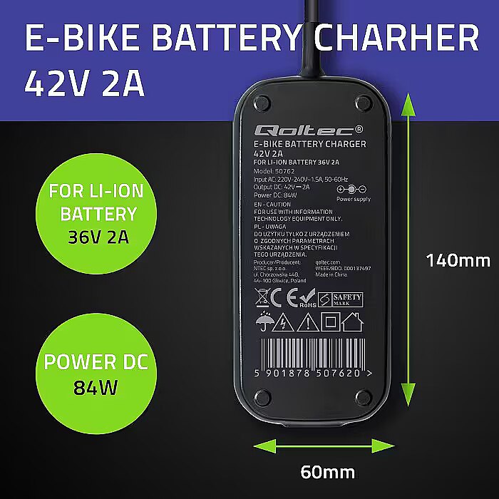 If you are looking for the right charger to charge your e-bike battery then be sure to check out our range. Qoltec chargers are characterized above all by a high degree of safety, as well as durability and high performance. Of course, it is important to remember that care and caution should be taken when charging a lithium-ion battery. Proper charging will have a positive effect on the life of the battery and allow you to maintain the desired performance for a long period of use.