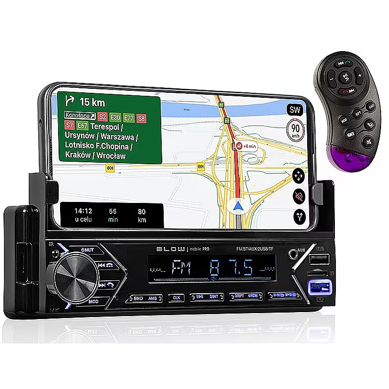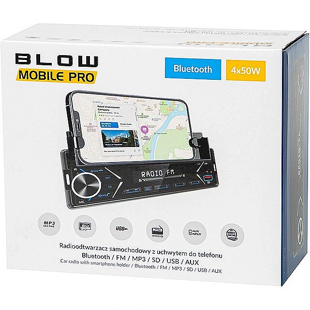 Description - Radio BLOW MOBILE PRO 1DIN uchwyt SMART Wbudowany mocny uchwyt trzymający telefon czy nawiga Nowoczesny design Informacja RDS Bluetooth 2 Gniazda USB, wyjście AUX, Pilot do montażu na kierownicę Wejście AUX Moc maksymalna 4x50W Nowoczesne i funkcjonalne radio samochodowe MOBILE PRO wyposażone jest w dwa wejścia USB, gniazdo microSD oraz AUX - umożliwia to odtwarzanie muzyki z urządzeń przenośnych oraz pamięci zewnętrznych a także ich ładowanie. Dodatkowo radio posiada moduł Bluetooth który pozwala na streaming muzyki z telefonu. Wbudowany mocny uchwyt trzymający telefon, tablet czy nawigację