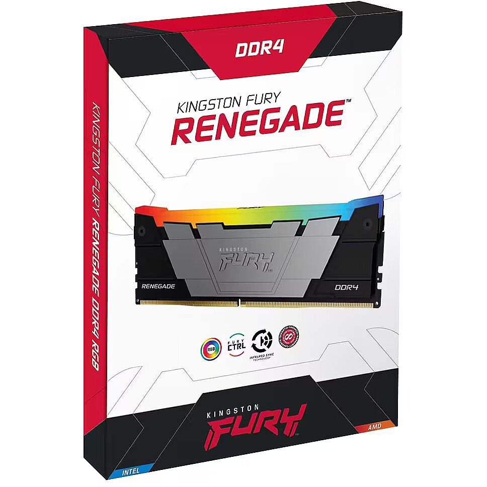 LongDesc - Kingston FURY™ Renegade DDR4 RGB* is the ideal upgrade for the power user who wants cutting-edge performance, with stylish RGB in their AMD- or Intel-based system. 10 LEDs create dynamic RGB lighting with Kingston FURY's patented Infrared Sync Technology™ for smooth, coordinated effects. Put in hours for work or play, crank up your frame rate, improve your workflow and edit gameplay in a flash thanks to speeds of up to 4600MT/s[*]* paired with quick latencies. The intense, stylish two-tone black heat spreader with black PCB is for fun and function to keep your system cool. Available in single module capacities of 8GB–32GB and kits of 2, 4 and 8 with capacities of 16GB–256GB. [Kingston FURY Renegade DDR4 RGB is Ready for AMD Ryzen, and Intel® XMP Certified] or XMP Ready.Stunning RGB styleBring your workstation to life with smooth, stunning RGB lighting effects*Patented Kingston FURY™ Infrared Sync Technology™RGB lighting stays synced thanks to Kingston FURY's Infrared Sync TechnologyPowerful aluminium heat spreader displays smooth RGB effectsThe two-tone black aluminium heat spreader and black PCB highlight the stunning RGB effects to keep your rig running and looking sharp.Intel XMP Certified or Read profilesIntel Extreme Memory Profile technology makes it possible to overclock with ease. Simply select one of the built-in, hand-tuned profiles in your BIOS to get the benefits of overclocking.Ready for AMD Ryzen™Get memory that’s Ready for Ryzen and will seamlessly integrate with your AMD-based system.