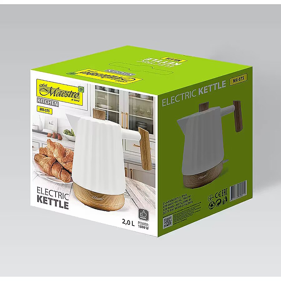 Description - The ceramic electric kettle Maestro MR-075 is an elegant device with a large capacity of 2.0 liters, ideal for people who need a larger amount of water at once. Thanks to the power of 1800 W, the kettle boils water quickly, which is extremely practical in everyday use. The housing is made of a combination of ceramics and bamboo, which gives it a modern, natural look and makes it fit perfectly into modern kitchen interiors.