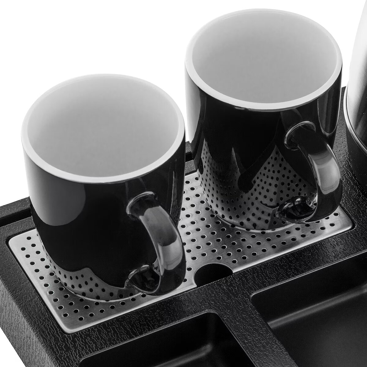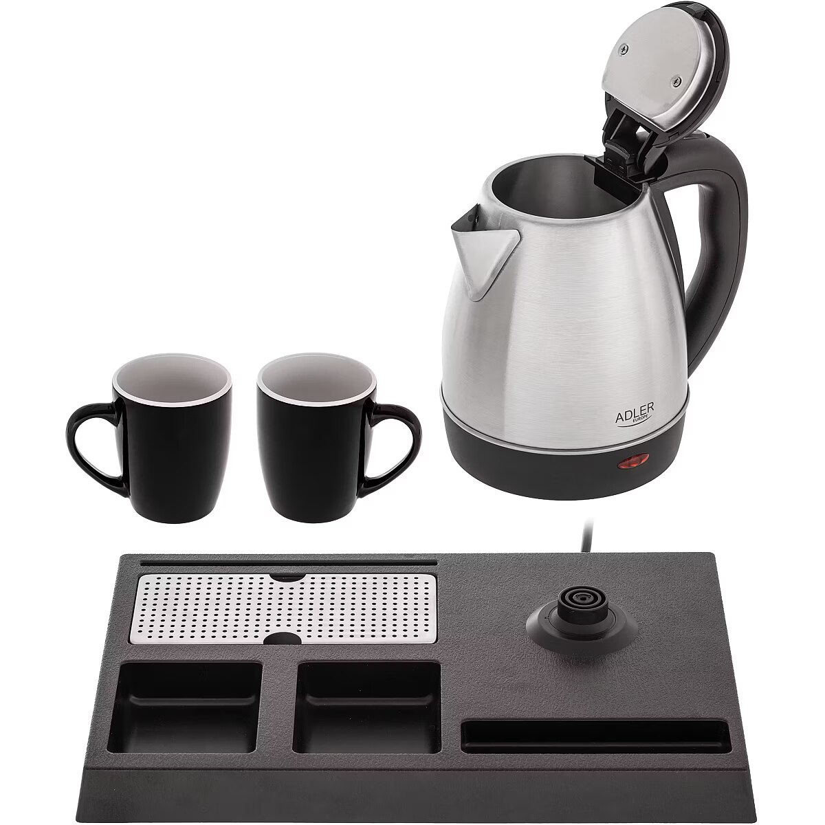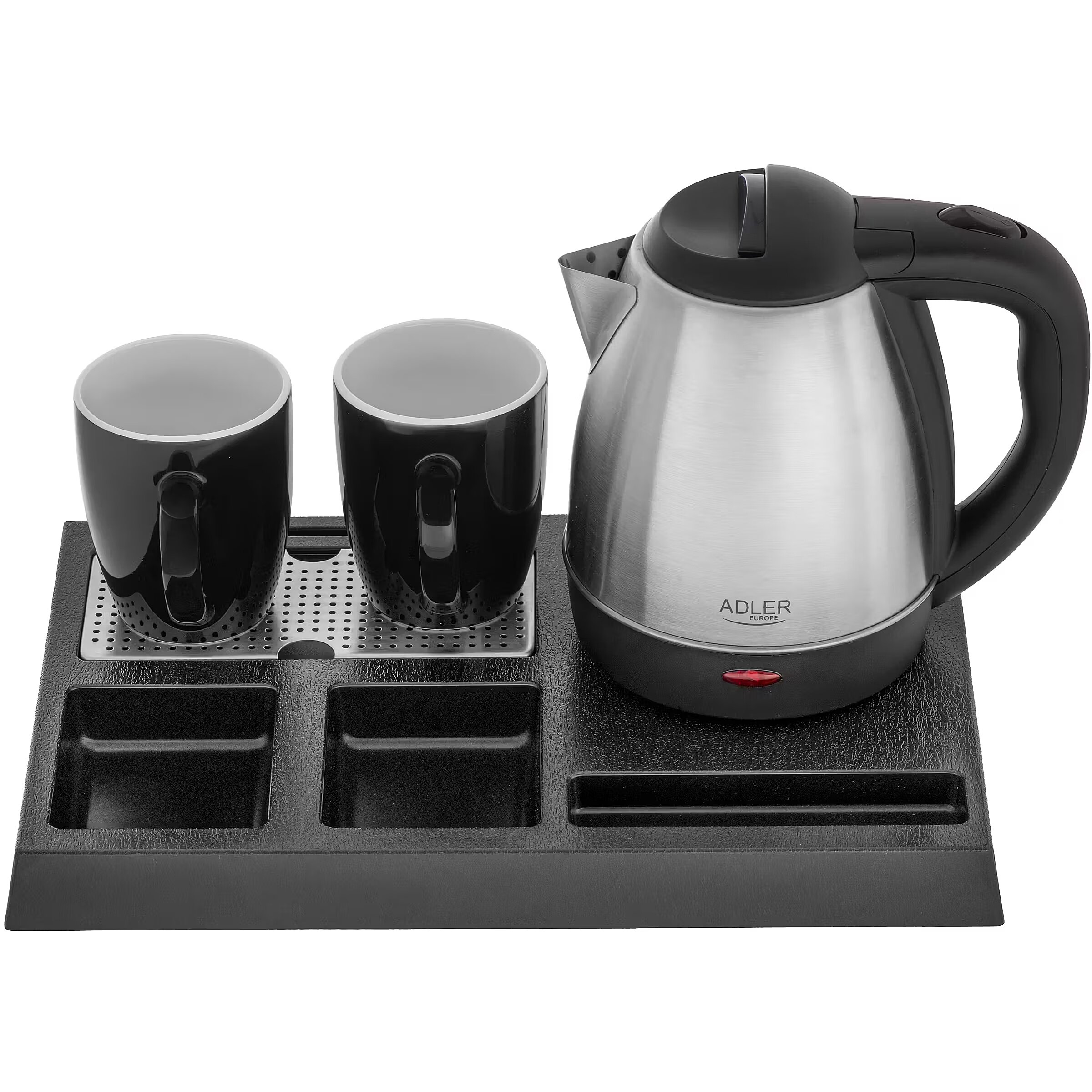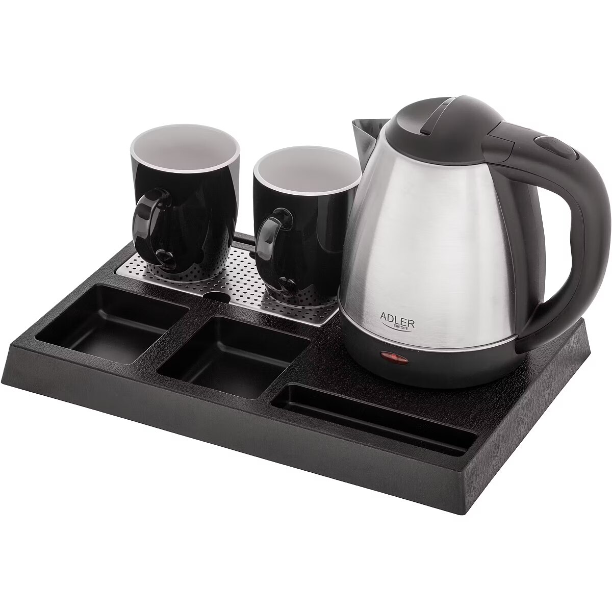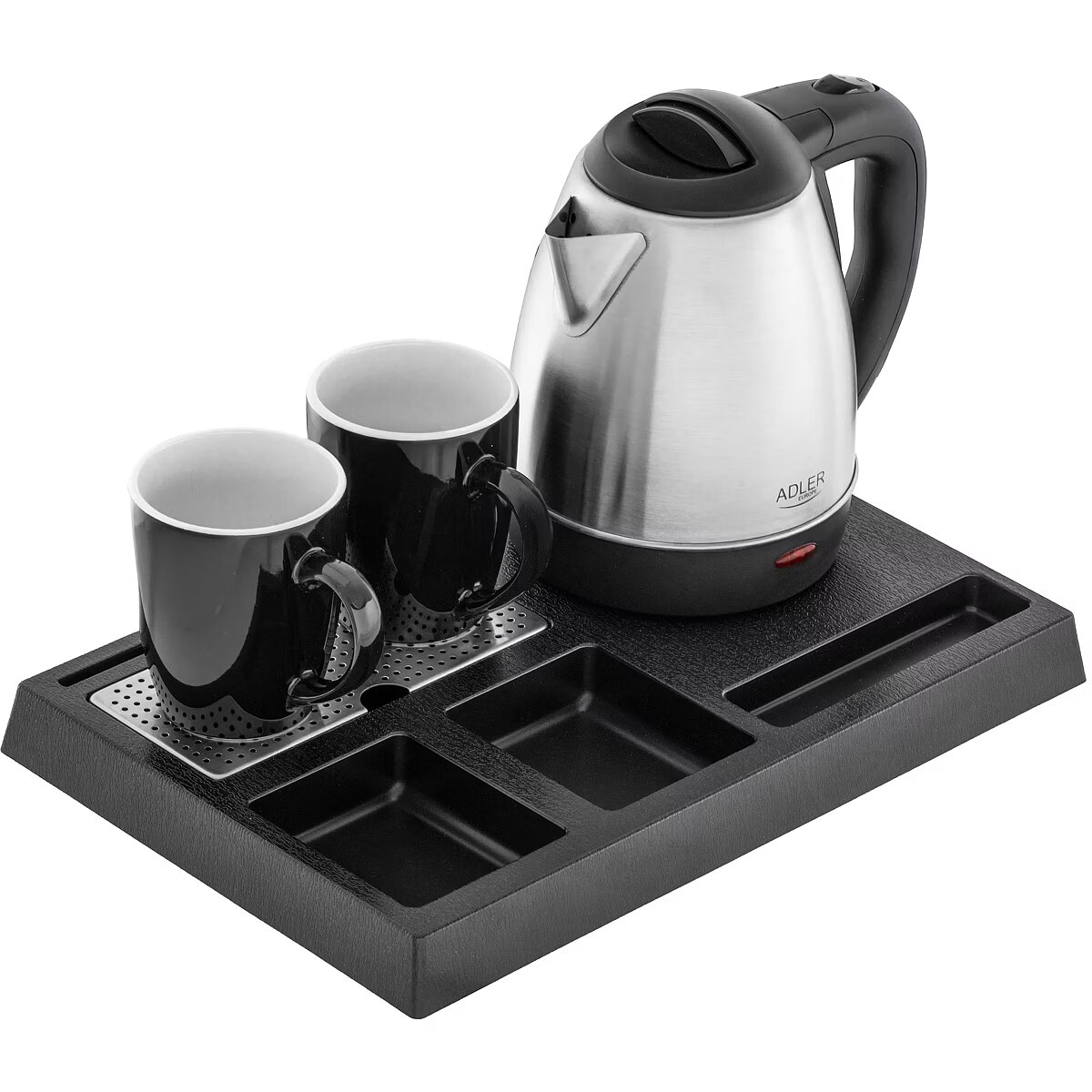Description - Elegancki i praktyczny zestaw powitalny Adler AD 1354 został zaprojektowany z myślą o hotelach, pensjonatach i apartamentach, aby zapewnić gościom wygodny dostęp do gorących napojów w pokoju. Stylowa taca z wytłoczonym dekorem, solidny czajnik ze stali nierdzewnej i ceramiczne kubki tworzą komplet, który łączy estetykę, trwałość i funkcjonalność. Najważniejsze cechy zestawu: Pełny komplet - taca, czajnik ze stali nierdzewnej i 2 kubki ceramiczne (320 ml, bez logo). Stylowa taca z ABS - wodoodporna, łatwa do czyszczenia, z subtelnym dekorem strukturalnym. Praktyczne przegródki - miejsce na saszetki z herbatą, kawą, cukrem, śmietanką lub słodzikiem. Stalowy ociekacz - utrzymuje porządek i czystość. Zintegrowane gniazdo zasilające czajnik - wygoda i oszczędność miejsca. Miejsce na łyżeczkę/mieszadełko - wszystko pod ręką.