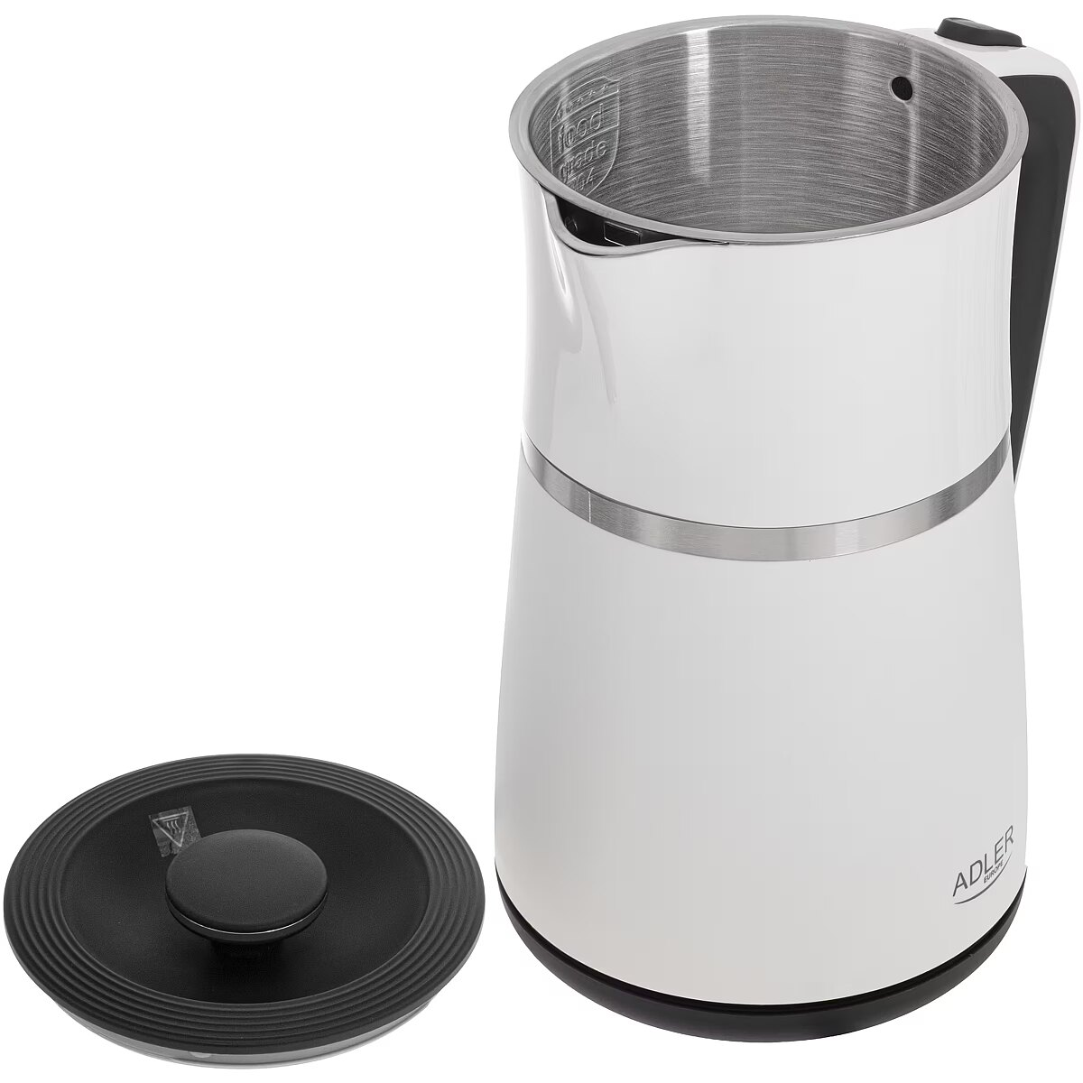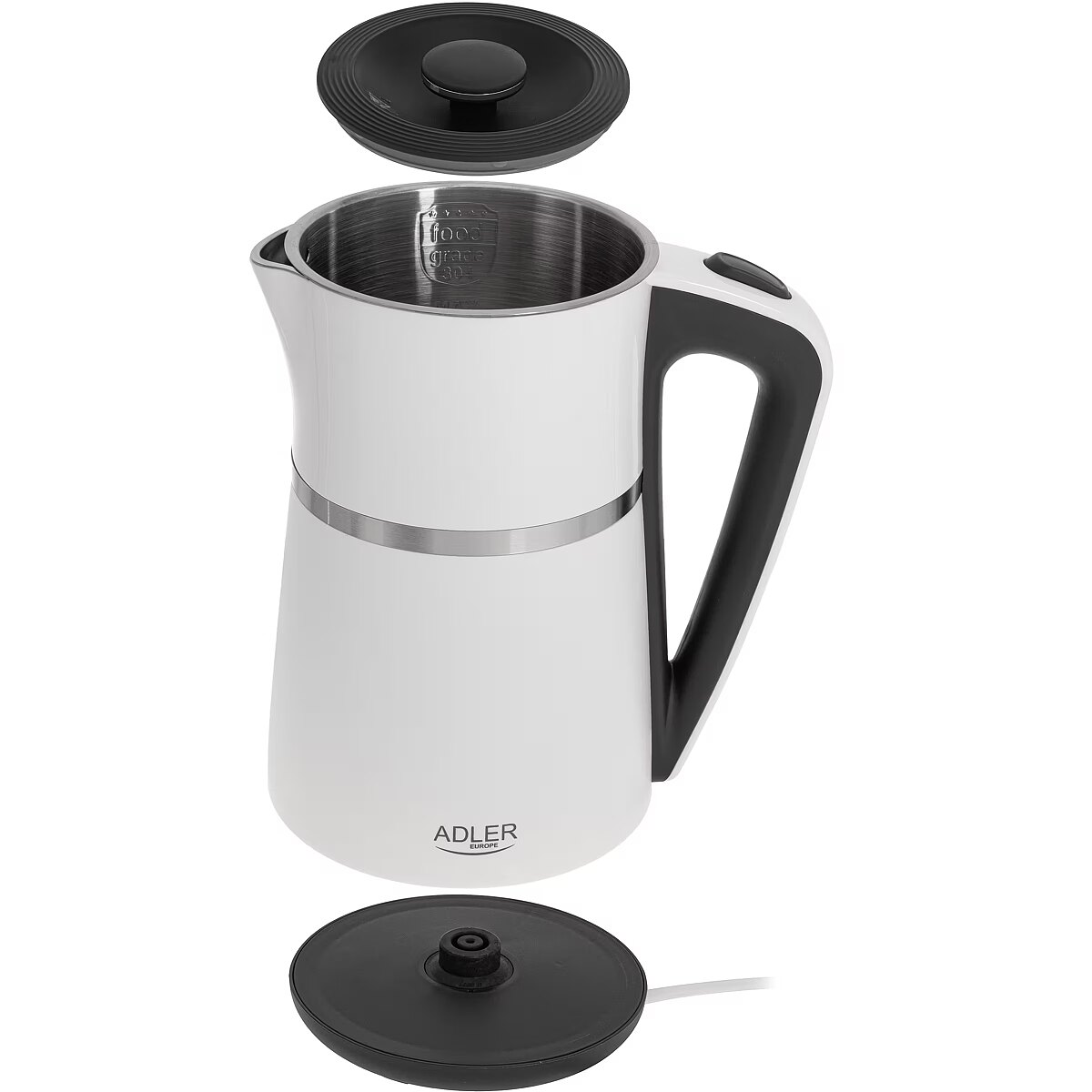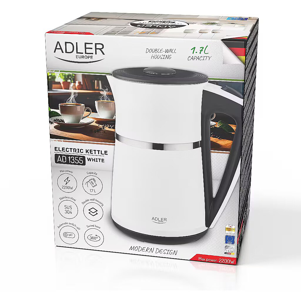 Description - Adler AD 1355 to połączenie nowoczesnego designu, bezpieczeństwa i wydajności. Czajnik o pojemności 1,7 L, z wnętrzem wykonanym ze stali nierdzewnej oraz trwałą, podwójną ścianką, zapewnia bezpieczne użytkowanie i dłużej utrzymuje temperaturę wody. Idealny do codziennego użytku w każdej kuchni. Najważniejsze cechy: Obudowa z podwójną ścianką - utrzymuje wysoką temperaturę wewnątrz, a zewnętrzna powierzchnia pozostaje bezpieczna w dotyku Duża pojemność: 1,7 L - doskonały dla całej rodziny Minimalna pojemność: 0,5 L - oszczędność energii przy mniejszych porcjach Obrotowa podstawa 360 - wygoda dla osób prawo- i leworęcznych Płaska grzałka ze stali nierdzewnej - szybkie gotowanie i łatwe czyszczenie Wnętrze ze stali szlachetnej - higieniczne i trwałe rozwiązanie Całkowicie zdejmowana pokrywa - łatwe nalewanie i czyszczenie Automatyczne wyłączanie po zagotowaniu - bezpieczna praca Zabezpieczenie przed gotowaniem na sucho + bezpiecznik termiczny - podwójna ochrona Schowek na przewód - porządek na blacie kuchennym Elegancki czarny design - pasuje do nowoczesnych kuchni