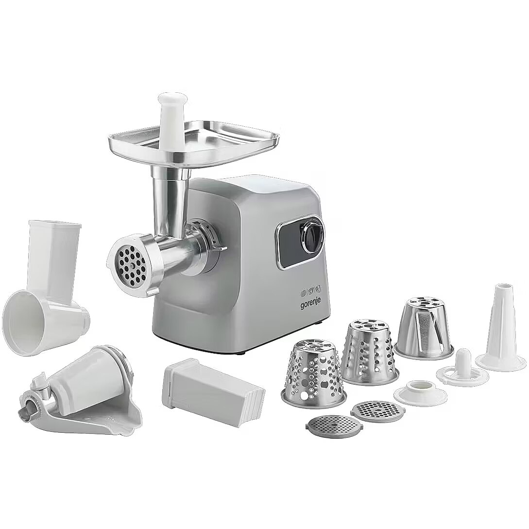 Packaging content > Accessories included - 3 stainless steel cutting plates (3 mm, 5 mm and 8 mm), Sausage filler, Cookie attachment with 4 moulds, Stuffer