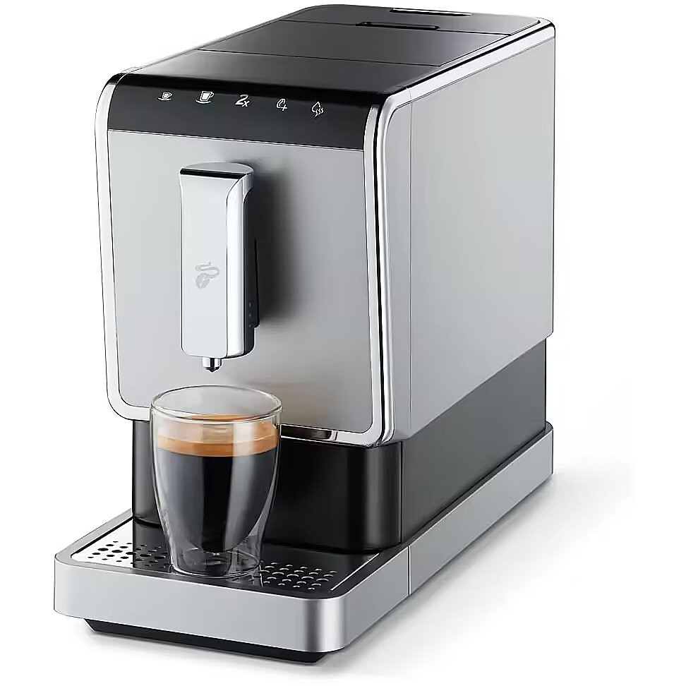 Description - Automatyczny ekspres do kawy Esperto Caff, antracytowy Zaprojektowany z myślą o kawach Tchibo Do parzenia espresso i Caff Crema, z funkcją Doppio (parzenie dwóch kaw po kolei) Programowalna objętość filiżanki od 25 do 250 ml Możliwość indywidualnego ustawienia intensywności kawy za pomocą funkcji Intense+ Wylot o regulowanej wysokości z podświetleniem filiżanki Kompaktowy, o szerokości zaledwie 18 cm Łatwe czyszczenie dzięki zdejmowanemu modułowi zaparzania Już jest - nowy automatyczny ekspres do kawy Tchibo! Zaprojektowany przez naszych kawowych ekspertów i stworzony z myślą o kawach Tchibo. Dzięki fabrycznym ustawieniom dopasowanym do kaw Tchibo BARISTA Caff Crema i kaw ziarnistych proponuje optymalny stopień zmielenia, który można regulować na urządzeniu. Za naciśnięciem przycisku Twój osobisty barista wyczaruje dla Ciebie espresso lub Caff Crema pełne niepowtarzalnego aromatu. Aby przyrządzić podwójną ilość napoju (espresso ok. 80 ml lub Caff Crema ok. 250 ml), naciśnij na przycisk Doppio - w ten sposób możesz zaparzyć dwie kawy po kolei. Jeśli lubisz mocną kawę, wciśnij przycisk Intense+, dzięki temu Twoja kawa zostanie zaparzona z większej ilości ziaren. Zamów ekspres i ciesz się pyszną, aromatyczną kawą!