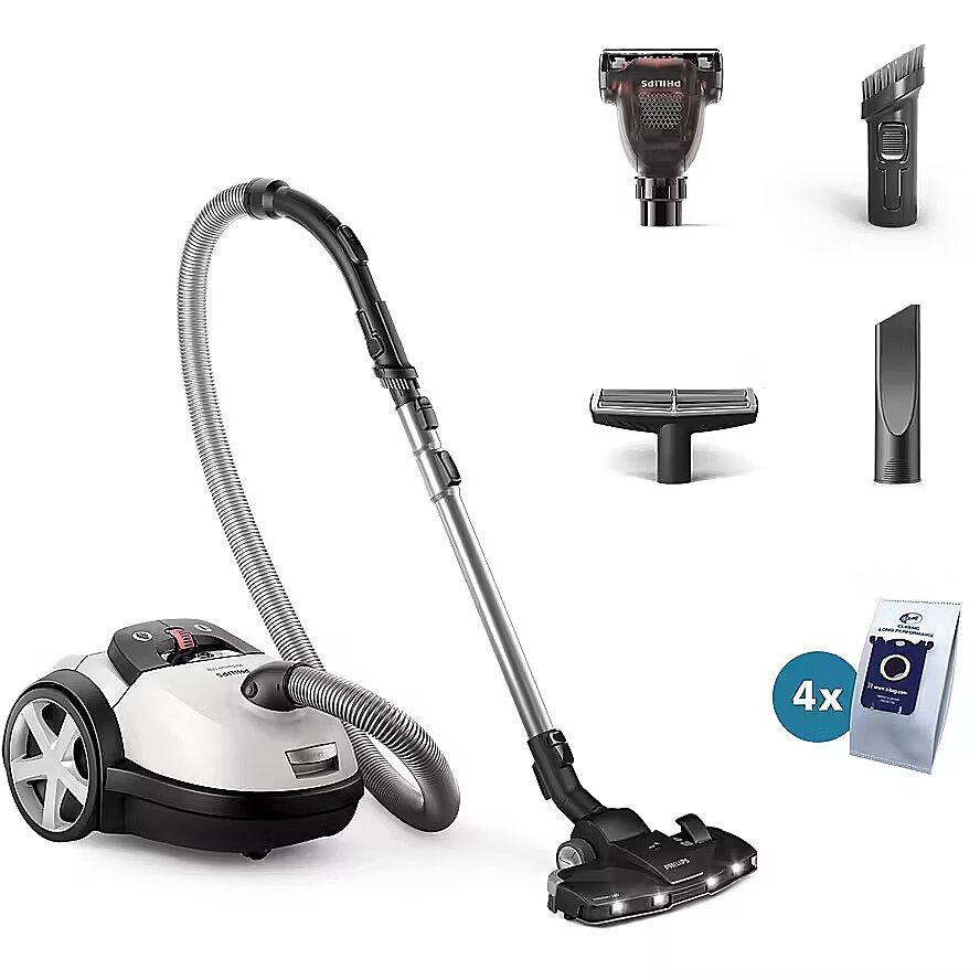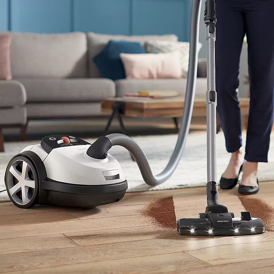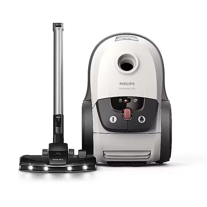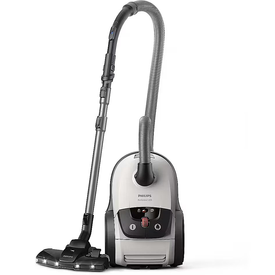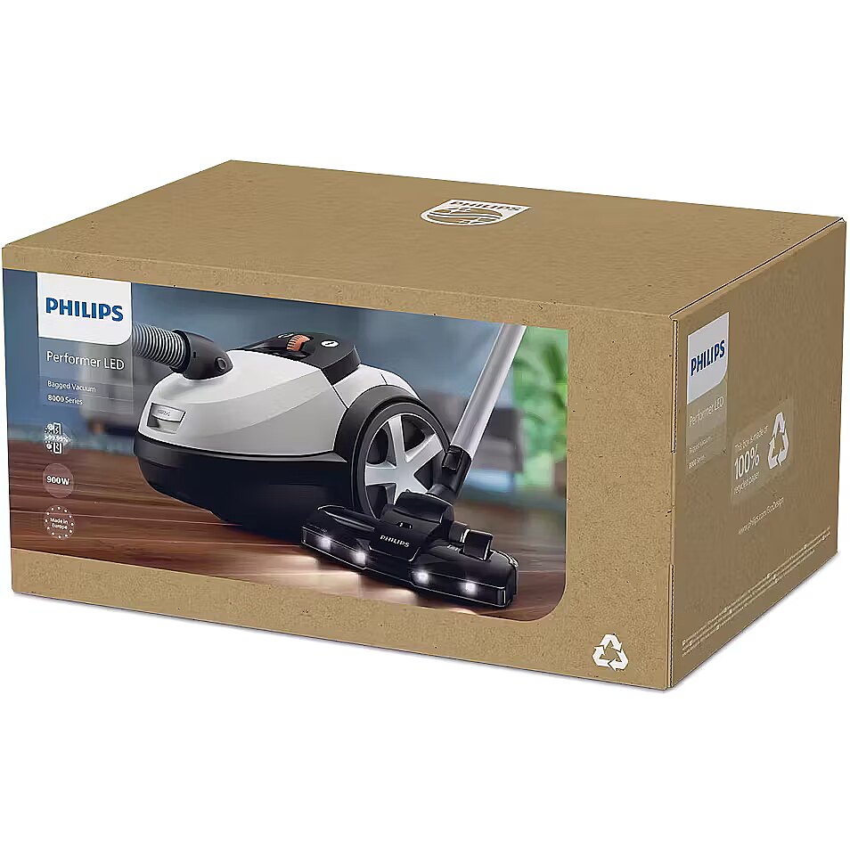 Description - Performer LED 8000 Series Vacuum cleaner with bag The most powerful of Philips bagged vacuum cleaners. With the Philips Performer LED 8000 series bagged vacuum cleaner, your floors will be cleaner than ever before. The TriActive+ LED nozzle with innovative floor light technology helps you find the smallest dust particles, and with a 900 W motor power, they will be sucked up in no time. 900 W, collects 99.9% of dust TriActive+ LED nozzle Mini turbo brush HEPA 13 filtration level