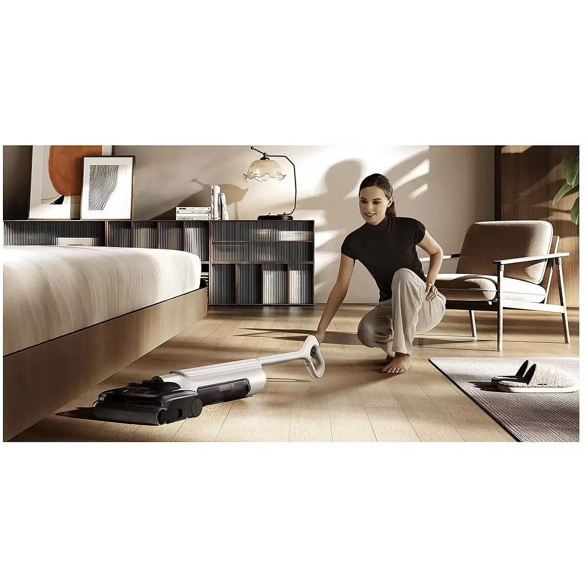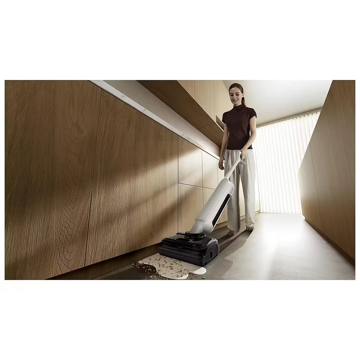 Description - Potężna wydajność zapewniająca bezproblemowe czyszczenie Napędzany silnikiem głównym o mocy 18 000 Pa z szybką szczotką rolkową szorującą 450 razy na minutę i dwoma trybami czyszczenia, odkurzacz z łatwością radzi sobie z różnymi powierzchniami podłogi. 4-stopniowe przeciwdziałanie splątaniu Bez wysiłku zasysa 3 000 pasm długich włosów Pływający skrobak grzebieniowy o stałym ciśnieniu ma ostrą, gęsto upakowaną konstrukcję zębów rekina z zębami dłuższymi o 400%. Wygładza włosy, zapobiegając ich plątaniu, umożliwiając szybkie i precyzyjne ssanie. Czterostopniowy system wychwytuje, rozczesuje, prowadzi i odkurza do 3 000 długich pasm bez wysiłku i bez plątania. Zintegrowane odkurzanie, mopowanie i czyszczenie szczotką Szybko radzi sobie z uporczywymi mokrymi i suchymi plamami Łącząc odkurzanie, mopowanie i czyszczenie szczotką rolkową w jednym, posiada system czystej wody w czasie rzeczywistym, który jednocześnie radzi sobie z włosami, cząsteczkami i uporczywymi plamami, eliminując kłopoty związane z tradycyjną rutyną odkurzania przed mopem. 5 Funkcje zapobiegania plamom z wody Podłogi szybko schną, a ich powierzchnie są mniej śliskie Odkurzacz oferuje 5 funkcji usuwania plam z wody. Dzięki skróceniu czasu schnięcia o 9% podłogi schną szybciej i są mniej śliskie, co zapewnia lepsze czyszczenie i pielęgnację podłóg. Używa gorącej wody do namaczania i mycia Usuwa brud i nieprzyjemne zapachy, zapewniając skuteczne i głębokie czyszczenie Gorąca woda skutecznie usuwa uporczywe plamy i zabrudzenia ze szczotki rolkowej, zapewniając dokładne czyszczenie i eliminację zapachów. Suszenie gorącym powietrzem w temperaturze 80°C Skuteczne suszenie i usuwanie zapachów dla świeżości Ciągły przepływ powietrza o wysokiej temperaturze 80°C skutecznie osusza szczotkę walcową, zapobiegając rozwojowi pleśni i eliminując nieprzyjemne zapachy. Prasowanie w wysokiej temperaturze 100°C Ulepszona konserwacja w celu przywrócenia puszystości Dzięki wbudowanej płycie grzewczej podstawa prasuje szczotkę rolkową w temperaturze 100°C za pomocą mikrociśnienia w trybie suszenia na gorąco. W połączeniu z obrotem o 360° do przodu i do tyłu, szczotka rolkowa wysycha bardziej efektywnie, zapewniając większą puszystość. Elastyczne czyszczenie w pozycji leżącej pod kątem 180° Głębokie i szczegółowe czyszczenie niskich przestrzeni Lekka, smukła obudowa i elastyczna konstrukcja pozwalająca na leżenie pod kątem 180°* sprawiają, że odkurzacz bez wysiłku dociera pod łóżka i sofy o głębokości do 104 cm, dzięki czemu nawet trudno dostępne miejsca są czyste i wolne od kurzu. Umieszczony w dół zbiornik na wodę do czyszczenia pod ciśnieniem Wygodny i lekki, aby zmniejszyć zmęczenie Dzięki zbiornikowi czystej wody umieszczonemu u podstawy, środek ciężkości jest obniżony, co ułatwia obsługę i zmniejsza zmęczenie. Taka konstrukcja zwiększa również nacisk szczotki rolkowej na podłogę, poprawiając wydajność w walce z uporczywymi zabrudzeniami. 40-minutowa żywotność baterii Wystarczająco dużo, aby posprzątać duży dom Wbudowana bateria o dużej pojemności 4 000 mAh zapewnia do 40 minut pracy na baterii. W połączeniu z dużymi zbiornikami na czystą i brudną wodę, odkurzacz z łatwością poradzi sobie z dużymi domami za jednym razem.