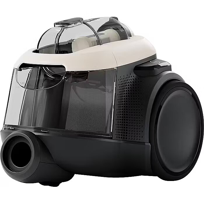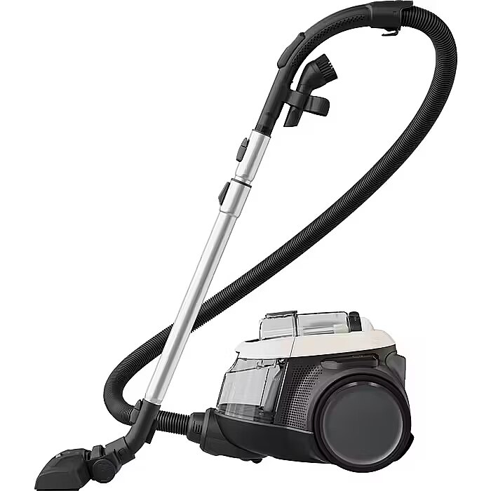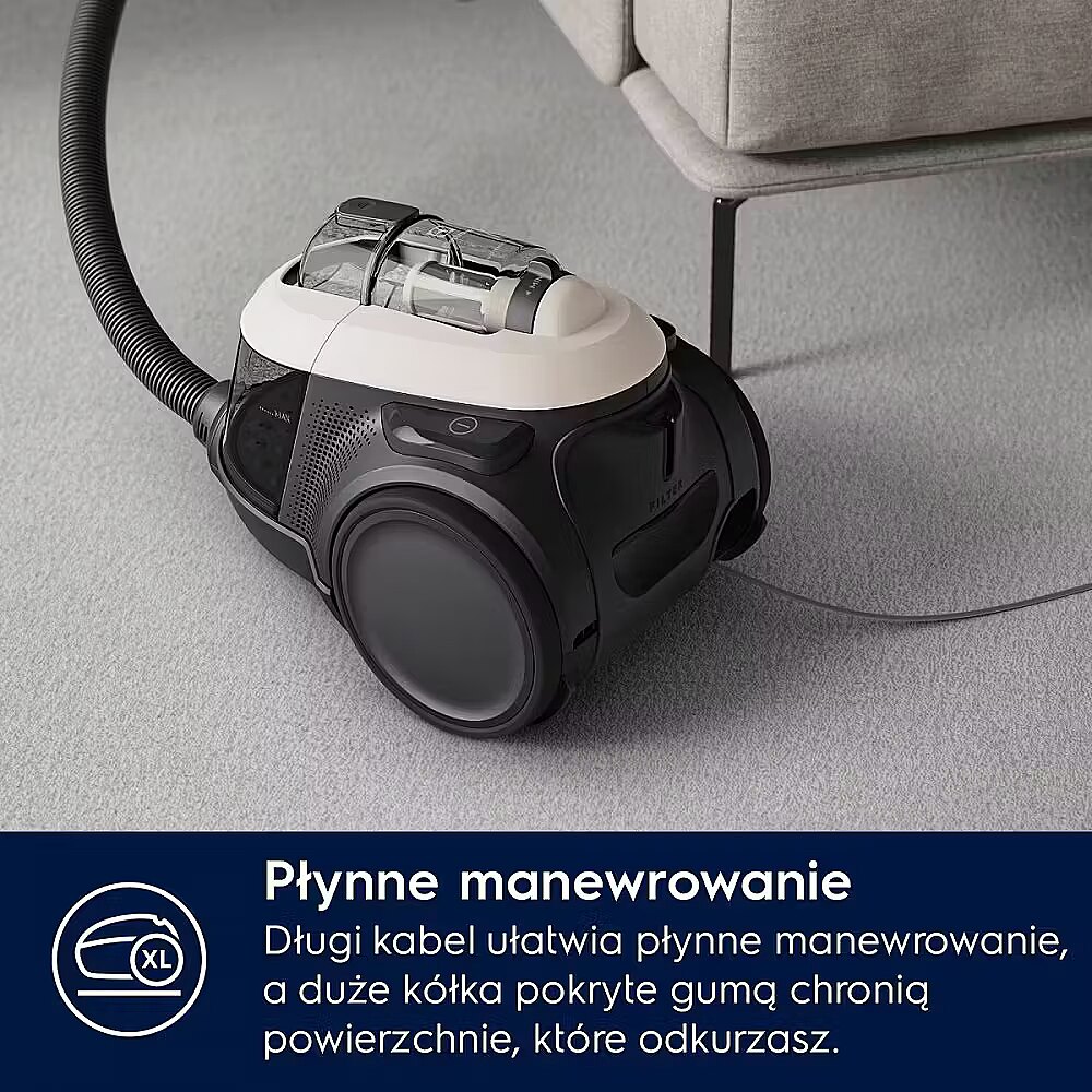 The cyclonic system ensures reliable performance from start to finish, even with a full container. It retains up to 99% of its initial vacuuming power after the container is filled, at the maximum power setting, in accordance with IEC 62885-2, version 1.0: 5.1, 5.7, and 5.9.