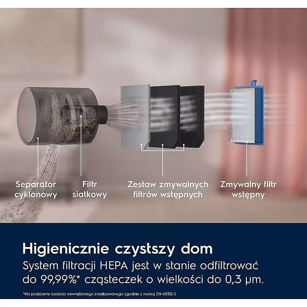 Hügieenilisem kodu HEPA-filtrisüsteem suudab filtreerida kuni 99,99%* kuni 0,3 mikronitest osakestest, sealhulgas peenest tolmust, tolmulestadest ja allergeenidest, tagades puhtama õhu.