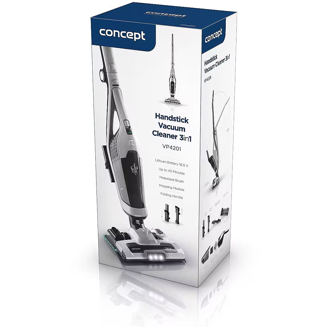 Description - WET AND DRY VERTICAL BATTERY-POWERED VACUUM CLEANER 3IN1 18.5 V VP4201 The vertical battery-powered vacuum cleaner with a mop and handheld vacuum will make cleaning your home easier. It is equipped with a motor-driven turbo brush and operates for up to 40 minutes on a single charge. Eliminates viruses and bacteria Want to feel truly safe at home? The VP4201 is another Concept vacuum that will help fight viruses and bacteria. Simply add an appropriate disinfectant to the water tank, and your floors will be perfectly clean and disinfected. 3 in 1: Vacuums and Mops The cordless VP4201 vacuum cleaner will help you efficiently clean your entire home. The vacuum, handheld vacuum, and mop in one allow for convenient cleaning and simultaneous mopping of all hard surfaces in your home. All this without unnecessary dust swirlinga feature especially appreciated by families with small children and allergy sufferers. Mop Mopping has never been easier. Just fill the 150 ml water tank, attach the mop, and secure it to the vacuum with one simple motion. Moisten the mop by pressing the button on the tank, and you can start mopping and vacuuming at the same time. Long Battery Life and Constant Suction Power The VP4201 vacuum is equipped with a high-quality 2000 mAh Li-Ion battery, which provides comfortable cordless cleaning. One charge is enough for 40 minutes of operation, so you have plenty of time to clean your entire home. The VP4201 operates on the principle of cyclonic suction, channeling dust and dirt directly into a 600 ml collection container using centrifugal force. The main advantage of cyclonic suction is constant suction power and the absence of bags. Nothing Escapes It Want to keep every corner of your home tidy? Thanks to the 3 LED diodes integrated into the VP4201, you wont miss a thing. They perfectly illuminate even the darkest spots in your home, ensuring everything remains impeccably clean. Easy Maintenance Cleaning the vacuum is very quick and easy. When the dirt container is full, press the release button at the top of the vacuum, remove the container, take out the filter, and clear out the dust and dirt. Then, reinsert the emptied container back into the vacuum. Handheld Vacuum The VP4201 vacuum is a truly versatile helper. It comes with a removable unit for handheld vacuuming, which is especially useful for cleaning crumbs on tables, kitchen counters, keyboards, or car trunks. Thanks to the 2-in-1 crevice nozzle located directly on the vacuum body, you can vacuum even hard-to-reach areas. Compact Design The vacuum charges via an adapter, and a full charge takes only 45 hours. Thanks to its foldable handle, it occupies minimal space.