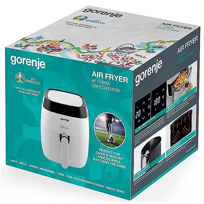 LongSummaryDescription - Gorenje AF1409DW. Product type: Hot air fryer. Product colour: Black, White, Control type: Touch, Material: Metal. Power: 1400 W. Width: 280 mm, Depth: 306 mm, Height: 340 mm. Package width: 385 mm, Package depth: 332 mm, Package height: 325 mm