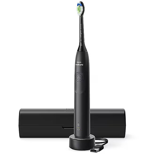 Key Features: Cleaning Modes: Clean (daily cleaning) Intensity Levels: 2 — high and low Speed: 62,000 movements per minute Timers: SmarTimer (2 minutes) and BrushPacer (zone change prompts) Pressure Sensor: reduces vibration when excessive pressure is applied BrushSync: replacement reminder for brush head Operating Time: up to 21 days on a single charge Battery Type: rechargeable lithium-ion Charging: via USB-A (power adapter not included) Color: black Included in the Box: Philips Sonicare 5300 toothbrush handle W2 Optimal White brush head Charging device Compact travel case