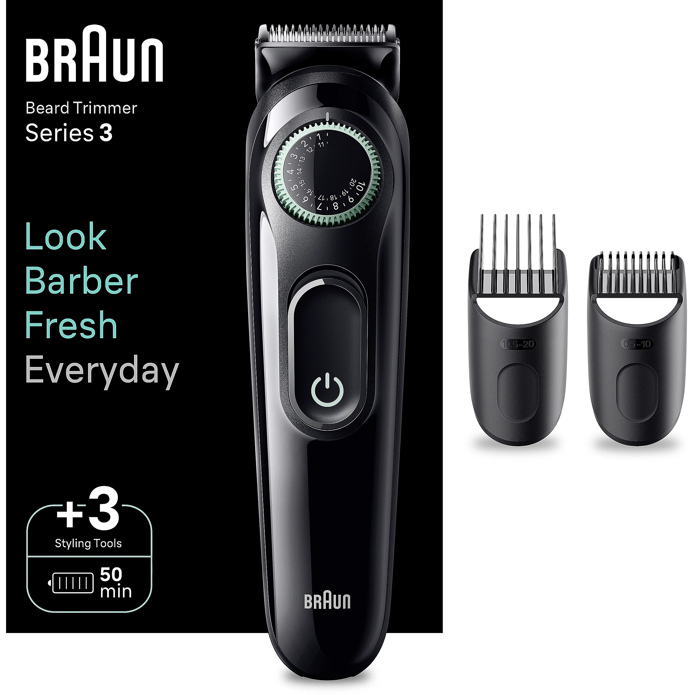 LongSummaryDescription - Braun BeardTrimmer 3 BT3411. Minimum hair length: 0.5 mm, Maximum hair length: 2 cm, Step precise: 0.5 mm. Product colour: Black, Green. Power source: Battery, Operating time: 50 min, Battery type: Built-in battery. Weight: 210.9 g, Battery weight: 13 g. Package width: 57 mm, Package depth: 137 mm, Package height: 282 mm