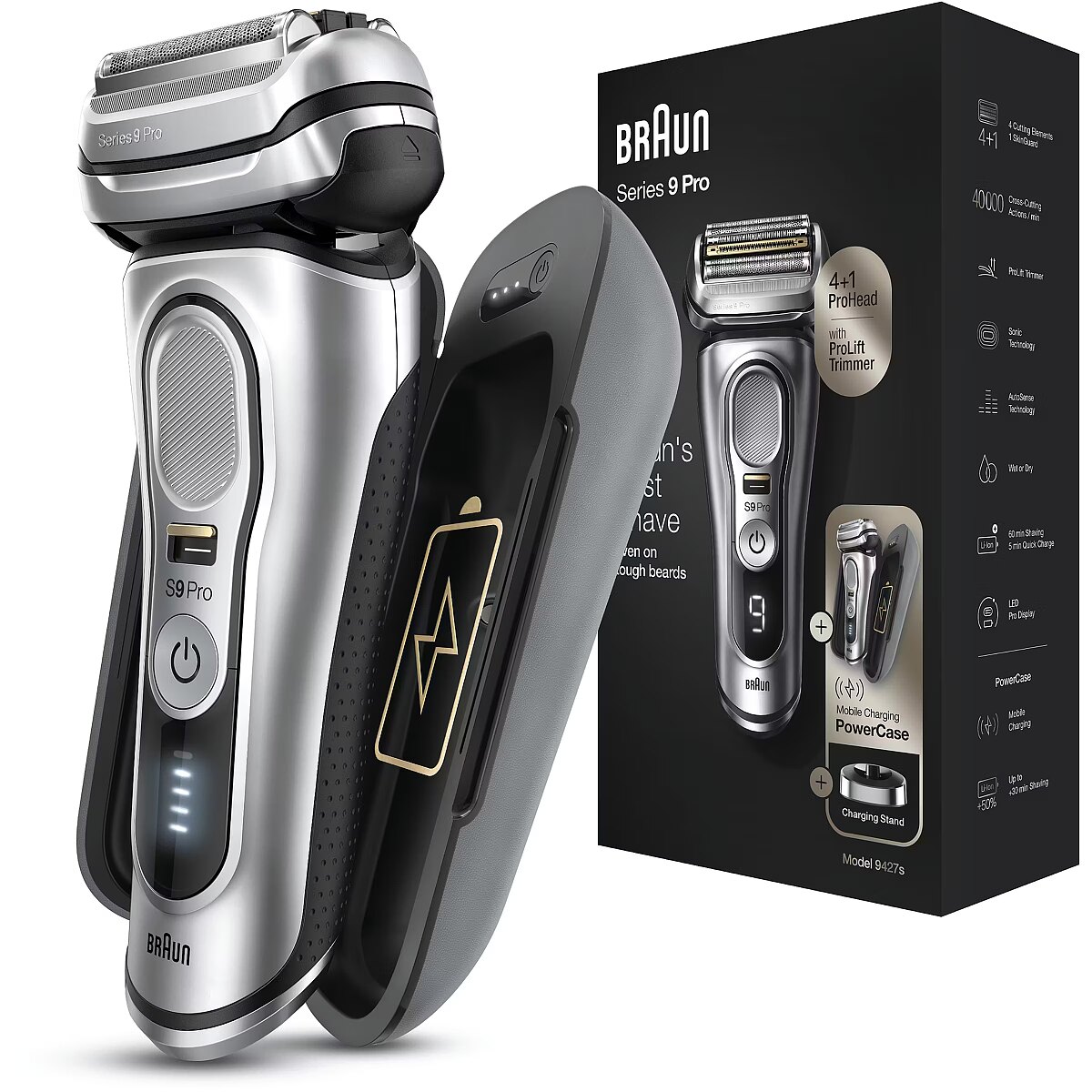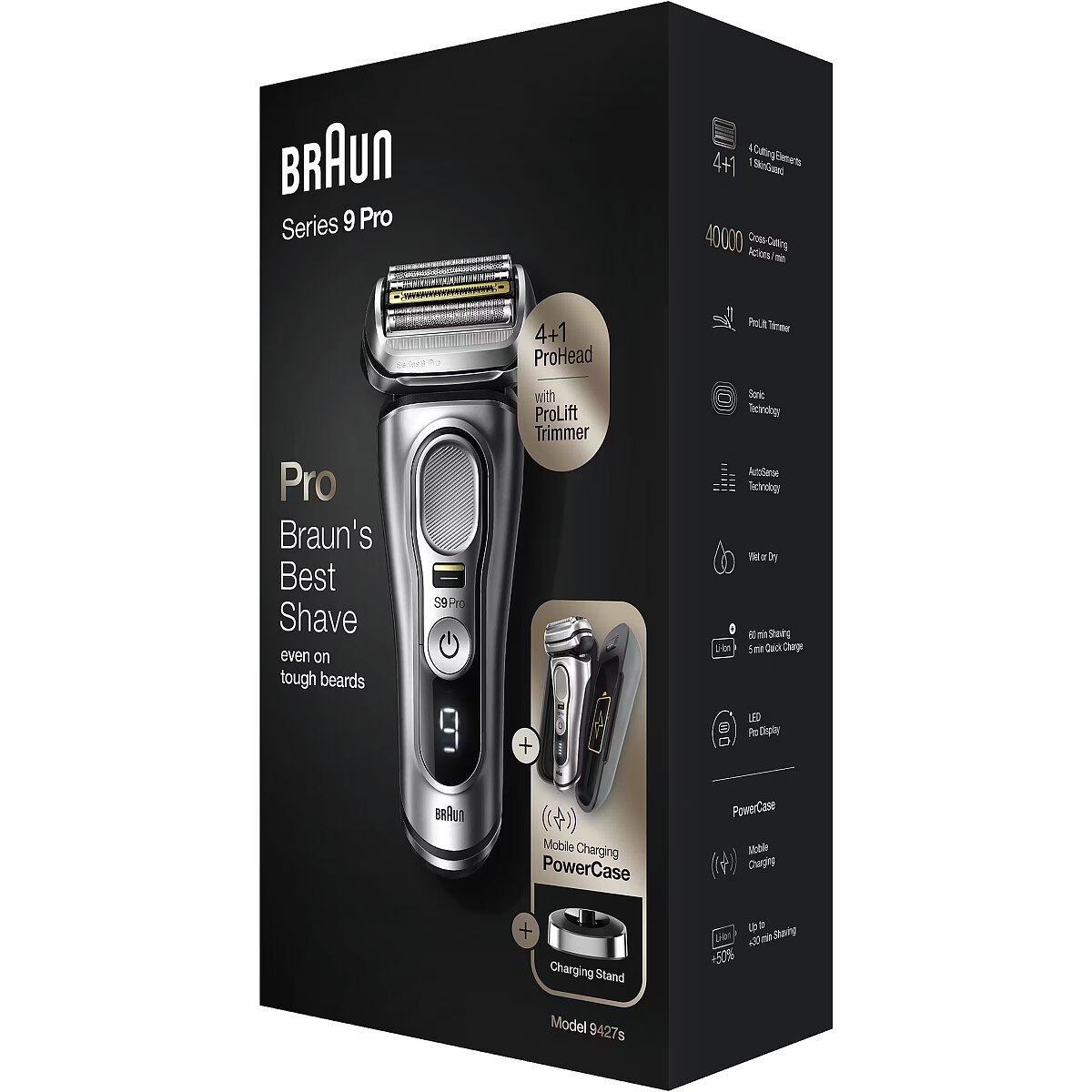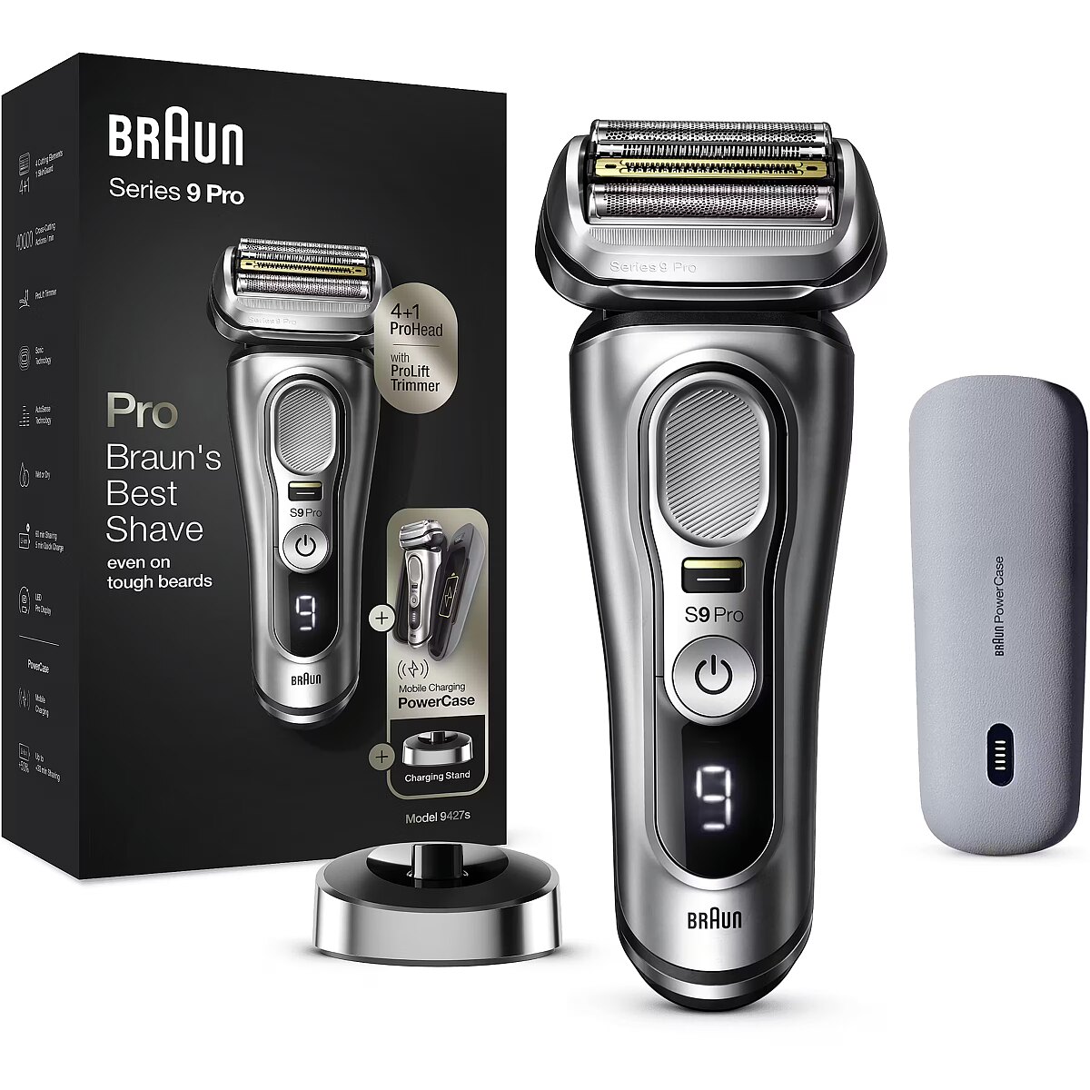 Technical_details - Series 9 Pro - 9427s, shaver The Series 9 Pro - 9427s shaver is Braun's most efficient electric shaver, now even better with the Pro shaving head. The innovative ProLift trimmer and the unique Sonic technology help to shave up to 10% faster (compared to the previous Braun Series 9) while being gentle on the skin. The ProLift Trimmer is designed to gently capture stubborn hair?– regardless of whether it is a 1-, 3- or 7-day beard. In addition, the AutoSense technology recognizes the density of the beard growth and adapts automatically. The density is checked 13 times per second. This provides extra power when it really matters. Five synchronized razor elements capture more hair in one stroke for fewer strokes and therefore less skin irritation. The shaving head, which is flexible in 10 directions, masters even the most difficult contours: with independently movable shaving elements on a swivel head with MicroMotion and MacroMotion. The precision switch fixes the shaving head and allows difficult hair to be easily grasped?– and offers unparalleled precision and control. With the Series 9 Pro you can shave dry or use water, foam or gel - for even better gliding and a smoother skin feel. The rubberized, textured grip makes the razor safe and comfortable to use, even when wet. The Series 9 Pro's powerful lithium-ion battery has a runtime of 60 minutes and has a 5-minute quick charge option. With the included PowerCase you also get a portable charging case in which the shaver can be charged for up to 30 minutes of additional runtime. Type: Razor Silver EAN code: 4210201372578 Power supply: operating mode | Integrated battery Power supply: voltage adjustment | Yes Power supply: input voltage | 100 - 240V Power supply: battery | type | Li-Ion Power supply: battery | Uptime | 60 minutes Power supply: battery | loading time | 1 hour Power supply: battery | Fast Charge | 5 minutes Use: shaving, trimming Application: Wet, Dry Shaving/Cutting System: 10-D flexible shaving system, 5 synchronized shaving elements Shaving head: Movable shaving head, contour adjustment Shaving head: Micro-/MacroMotion, 2x Opti-Foil, ProLift Trimmer, Direct&Cut, Protective SkinGuard, MultiHeadLock (5 positions) Equipment: Integrated trimmer Material: Titanium coating (middle trimmer) Operation: Non-slip handle for safe handling Display/Indicator: Pro display with power indicator Cleaning: Fully washable Storage: PowerCase Feature: AutoSense technology, Wet&Dry technology Accessories: available | Charging station, power pack, PowerCase, cleaning brush