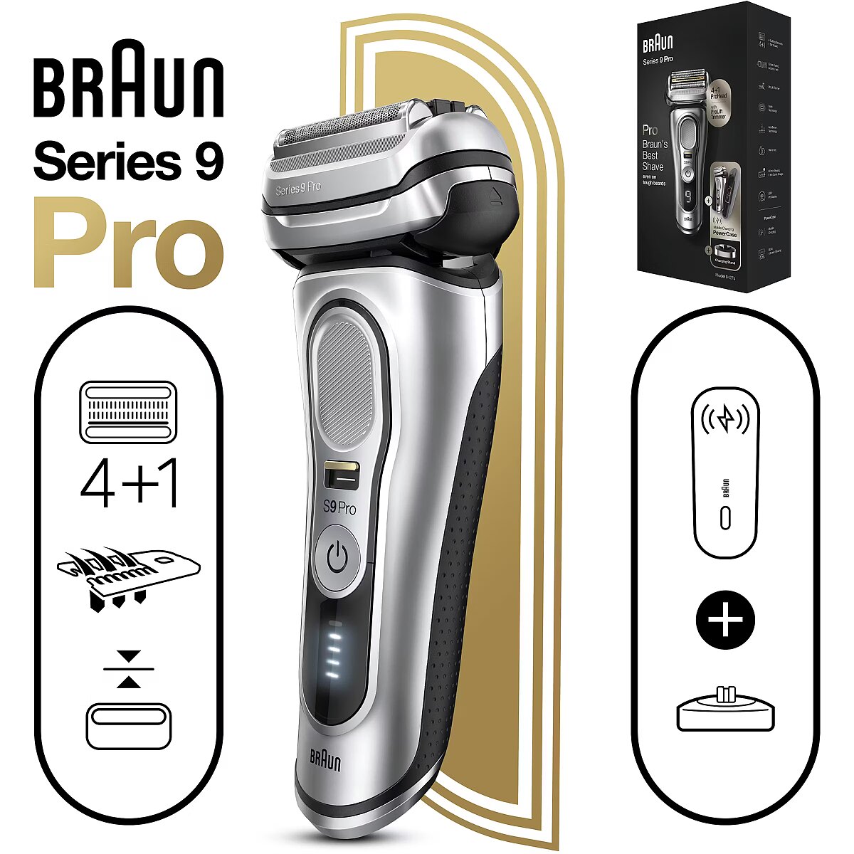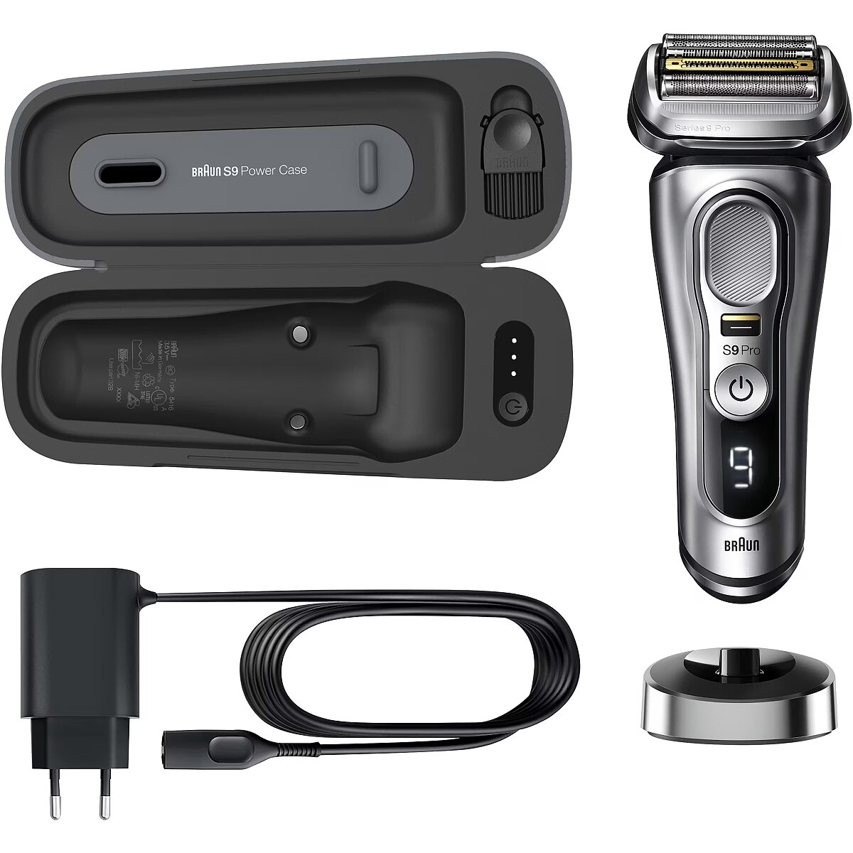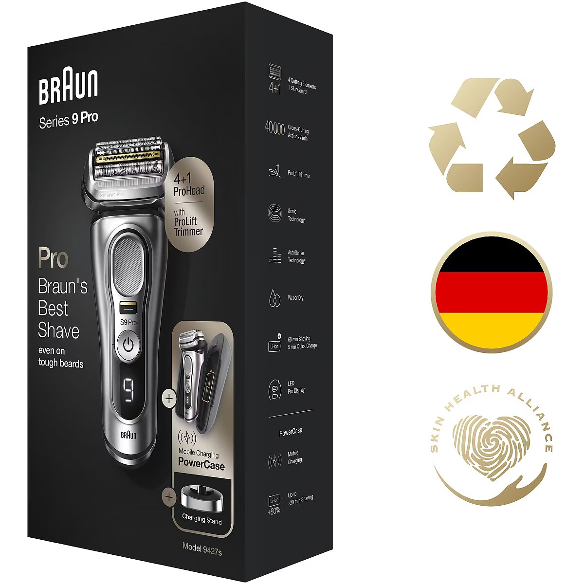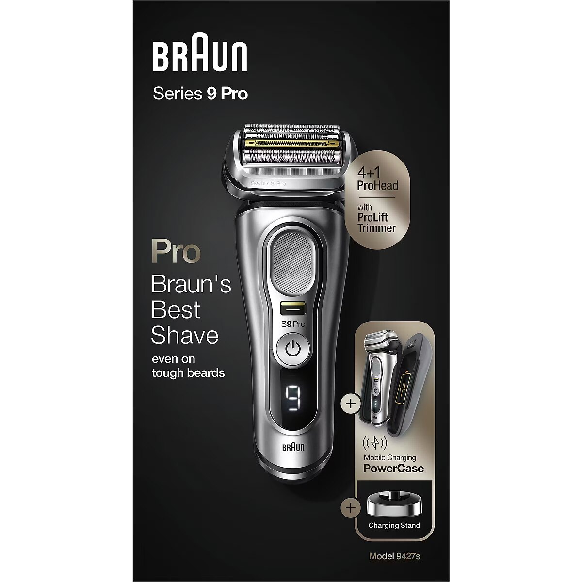 Technical_details - Series 9 Pro - 9427s, shaver The Series 9 Pro - 9427s shaver is Braun's most efficient electric shaver, now even better with the Pro shaving head. The innovative ProLift trimmer and the unique Sonic technology help to shave up to 10% faster (compared to the previous Braun Series 9) while being gentle on the skin. The ProLift Trimmer is designed to gently capture stubborn hair?– regardless of whether it is a 1-, 3- or 7-day beard. In addition, the AutoSense technology recognizes the density of the beard growth and adapts automatically. The density is checked 13 times per second. This provides extra power when it really matters. Five synchronized razor elements capture more hair in one stroke for fewer strokes and therefore less skin irritation. The shaving head, which is flexible in 10 directions, masters even the most difficult contours: with independently movable shaving elements on a swivel head with MicroMotion and MacroMotion. The precision switch fixes the shaving head and allows difficult hair to be easily grasped?– and offers unparalleled precision and control. With the Series 9 Pro you can shave dry or use water, foam or gel - for even better gliding and a smoother skin feel. The rubberized, textured grip makes the razor safe and comfortable to use, even when wet. The Series 9 Pro's powerful lithium-ion battery has a runtime of 60 minutes and has a 5-minute quick charge option. With the included PowerCase you also get a portable charging case in which the shaver can be charged for up to 30 minutes of additional runtime. Type: Razor Silver EAN code: 4210201372578 Power supply: operating mode | Integrated battery Power supply: voltage adjustment | Yes Power supply: input voltage | 100 - 240V Power supply: battery | type | Li-Ion Power supply: battery | Uptime | 60 minutes Power supply: battery | loading time | 1 hour Power supply: battery | Fast Charge | 5 minutes Use: shaving, trimming Application: Wet, Dry Shaving/Cutting System: 10-D flexible shaving system, 5 synchronized shaving elements Shaving head: Movable shaving head, contour adjustment Shaving head: Micro-/MacroMotion, 2x Opti-Foil, ProLift Trimmer, Direct&Cut, Protective SkinGuard, MultiHeadLock (5 positions) Equipment: Integrated trimmer Material: Titanium coating (middle trimmer) Operation: Non-slip handle for safe handling Display/Indicator: Pro display with power indicator Cleaning: Fully washable Storage: PowerCase Feature: AutoSense technology, Wet&Dry technology Accessories: available | Charging station, power pack, PowerCase, cleaning brush
