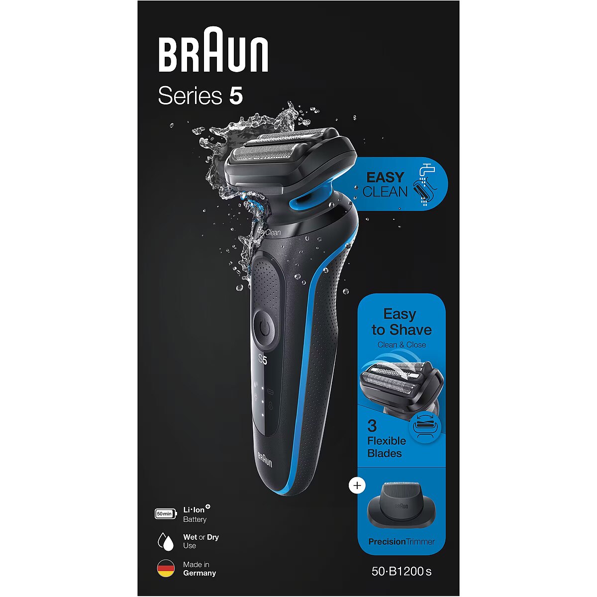 LongSummaryDescription - Braun Series 5 50-B1200s. Shaver system: Foil shaver, Product colour: Blue, Control type: Buttons. Power source: Battery, Battery technology: Lithium-Ion (Li-Ion), Battery type: Built-in battery. Weight: 305 g, Battery weight: 18.6 g. Package width: 67 mm, Package depth: 137 mm, Package height: 252 mm. Quantity per pack: 1 pc(s)