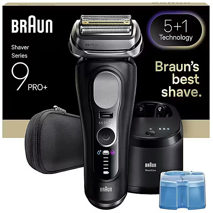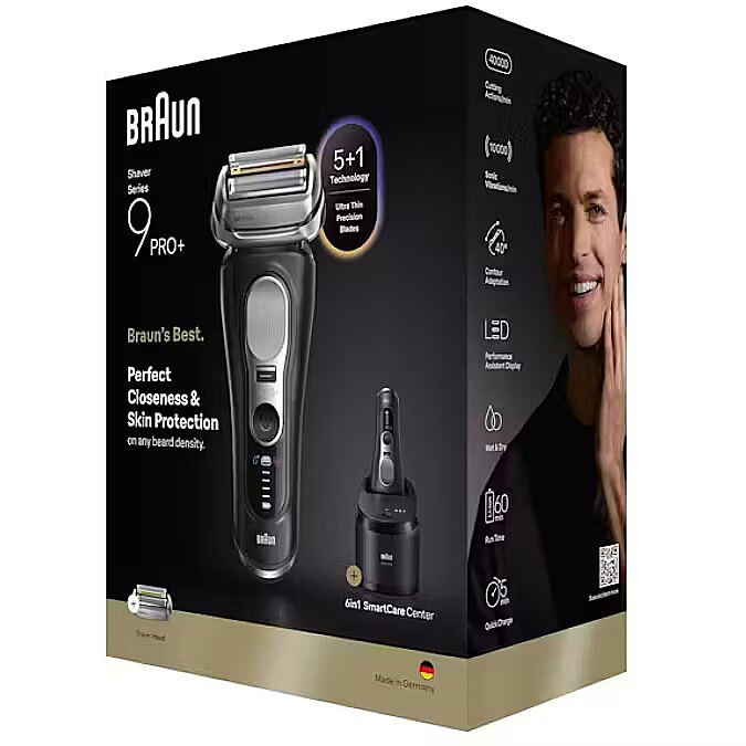 LongSummaryDescription - Braun Series 9 Pro+ 9660CC. Shaver system: Foil shaver, Product colour: Black, Silver, Blade material: Stainless steel. Power source: AC/Battery, Battery technology: Lithium-Ion (Li-Ion), Battery type: Built-in battery. Width: 66 mm, Depth: 44 mm, Height: 168 mm. Package type: Box. Quantity per pack: 1 pc(s)