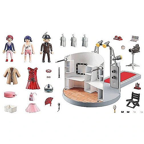 Accessories included - Figures: 1 Marinette, 1 Adrien, 1 Nadja; Accessories: 1 catwalk with make-up area, 1 folding chair, 1 basket, 1 hat box, 1 stand with 2 necklaces, 1 powder, 1 stand with make-up tools, 1 fan, 1 eye shadow box, 1 brush, 1 coat, 1 dress, 1 skirt, 1 mask, 2 hair ties, 1 stick, 1 microphone, 1 camera, 3 coat hangers, 4 bracelets, 1 helmet, 1 backpack, 1 hat with feather