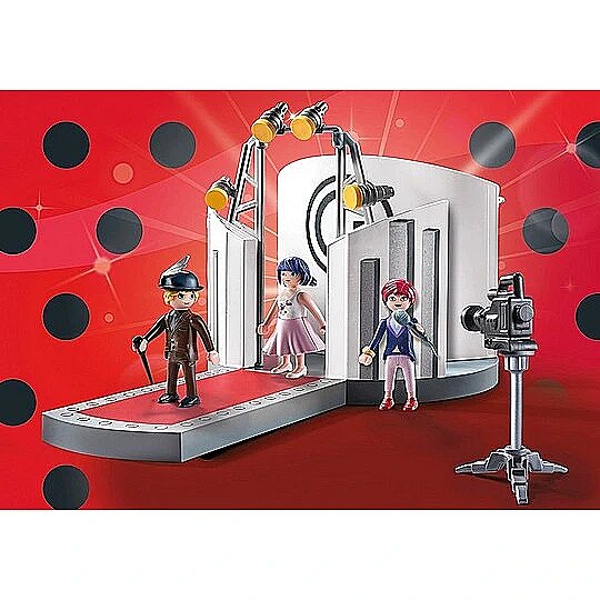 Description - Miraculous: Gabriel's Fashion Show with Marinette and Adrien as models on the catwalk at the Fashion Show in Paris. With make-up tools and accessories as well as various items of clothing to stage a fashion show. Including Marinette, Adrien and Nadja. Welcome to the exciting world of Ladybug and Cat Noir with the new PLAYMOBIL playset Miraculous: Gabriel's Fashion Show! The set includes the main character and aspiring fashion designer Marinette Dupain-Cheng, as well as Adrien Agreste, her classmate and model at the fashion show. The runway consists of a round baseplate, a detachable catwalk, and wall elements with two dressing stations. Here, the characters can prepare for their performances and store their make-up tools and accessories on the shelves of the dressing room wall. Marinette can choose between an elegant dress with a matching mask and fans, a trendy skirt, a backpack, as well as various necklaces and bracelets. Adrien comes with a silicone coat, a helmet, a cane, and a stylish hat. With this set, children can immerse themselves in exciting role-playing adventures and unleash their creativity and imagination. An absolute must-have for all Miraculous fans to recreate their favourite scenes and experience new adventures.