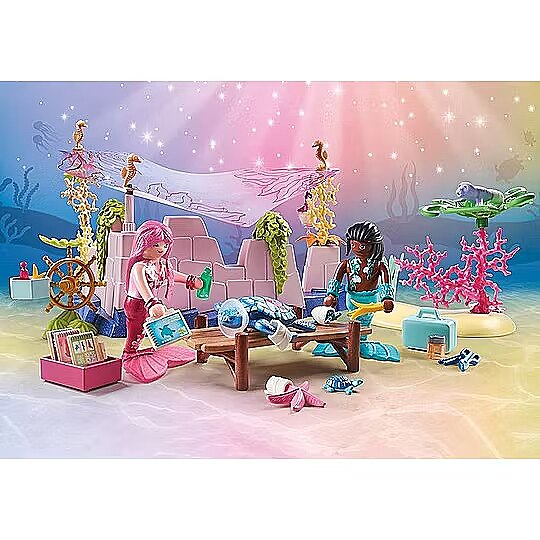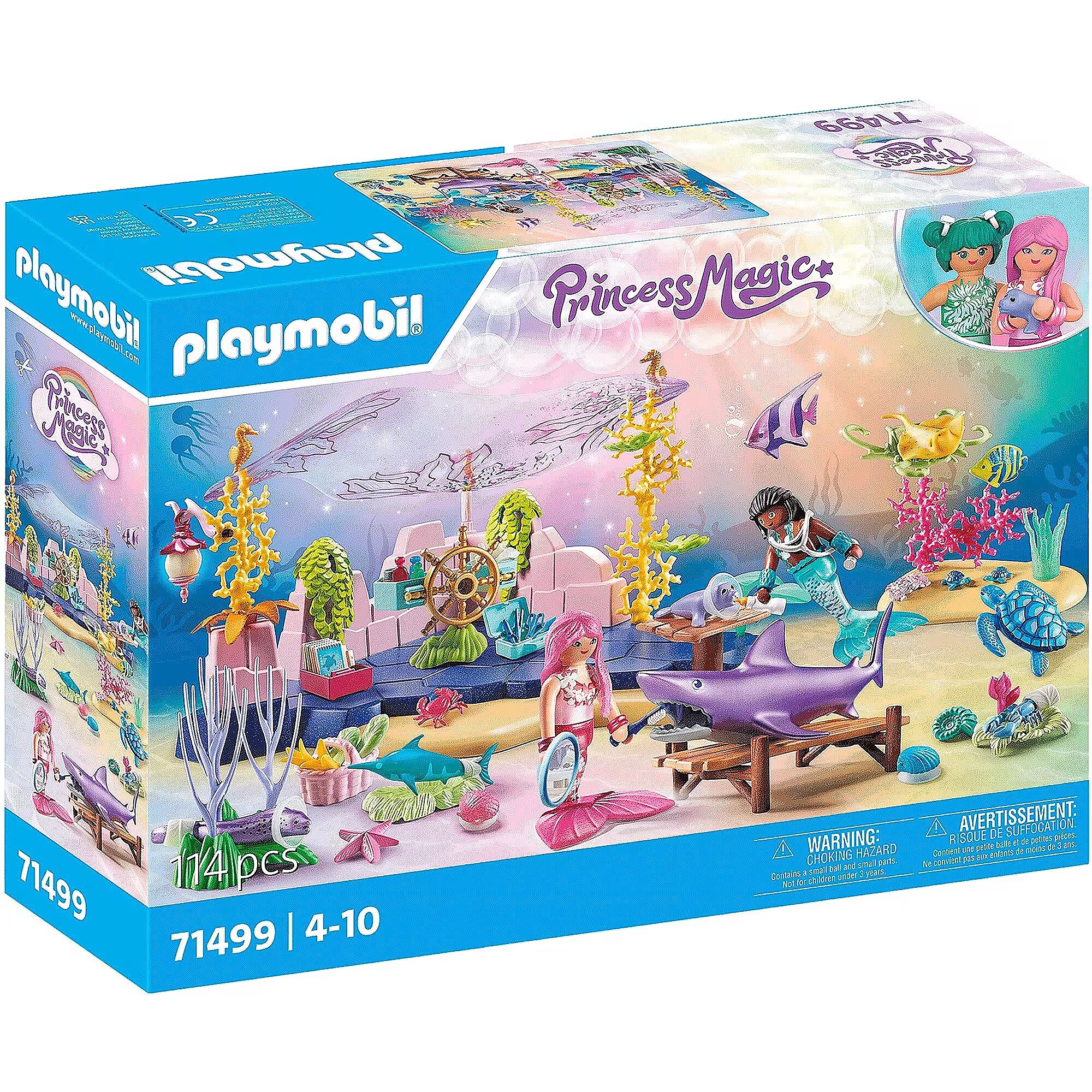 Technical_details - Dive into a magical underwater world with PLAYMOBIL Princess Magic! There, the sea creatures take care of the underwater animals: they bandage wounds or clean the teeth of a shark. There are many different sea creatures - including a cute baby seal and underwater turtles. Using corals, shells and decorative elements, a small underwater play world is created in which everything revolves around caring for and caring for animals. A magical set for mermaid fans ages 4 and up! Item no.: 100034700 Kind of construction toy EAN 4008789714992 Manufacturer no. 71499 Princess Magic series Parts 114 pieces Contents/equipment figures: 1 mermaid, 1 merman. Animals: 1 shark, 3 small seahorses, 1 crab, 1 lobster, 1 starfish, 2 baby turtles, 1 sea turtle, 1 baby seal, 1 baby swordfish, 1 ray, 1 moray eel, 1 spadefish, 1 butterflyfish. Accessories: 1 underwater care station with various plants, 1 underwater plant, 1 coral with underwater plants, 1 grass area, 1 lantern, 1 wooden table, 1 steering wheel with storage options, 2 pairs of arm cuffs, 1 leaf belt, 1 toothbrush, 1 mirror, 1 stethoscope, 1 suitcase, 1 Set of surgical cutlery, 3 neck braces, 7 bandages, 1 baby bottle, 3 cosmetic bottles, 1 glass with lid, 1 file box with 4 files, 1 basket, 2 flowers, 2 leaf bundles, 2 grass bundles, 2 decorative shells with suction cup, 1 snail shell, 1 sticker label with plasters and bandages Age recommendation from 4 years to 10 years Target group kindergarten children, school children Material: Plastic Warnings Warning: Not suitable for children under 36 months! Caution: Danger of suffocation due to small parts that can be swallowed!