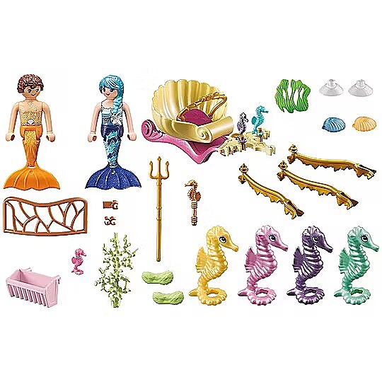 Accessories included - 2 mermaids 4 large seahorses 3 small seahorses Underwater carriage Fence Feeding trough Trident Hair flower 2 bunches of grass Grass element Coral 2 decorative shells with suction cup