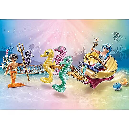 Description - Underwater inhabitants with a seahorse carriage Mermaids traverse the ocean in an elegant seahorse carriage and tenderly care for these underwater creatures. With two decorative shells to attach to smooth surfaces (including suction cup). Dimensions of reason with seahorses: 23 x 10 x 7 cm (L x W x H). Dive in and start playing with the wonderful PLAYMOBIL Underwater Dwellers set with seahorse carriage. The mermaids and their seahorses explore the depths of the ocean as they traverse its boundlessness in a glittering underwater carriage. Wonder what they will manage to discover today? The PLAYMOBIL Princess Magic Mermaids series invites you into a magical underwater world. The beautifully designed figures and animals encourage children aged 4 and up to go on more and more adventures. The set includes two PLAYMOBIL figures, four large seahorses, an underwater carriage and many other accessories. Thanks to the suction cups, the shells can be attached to smooth surfaces.