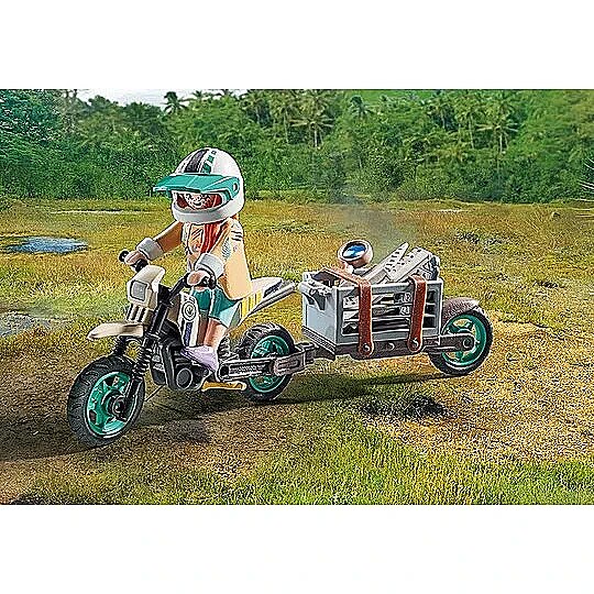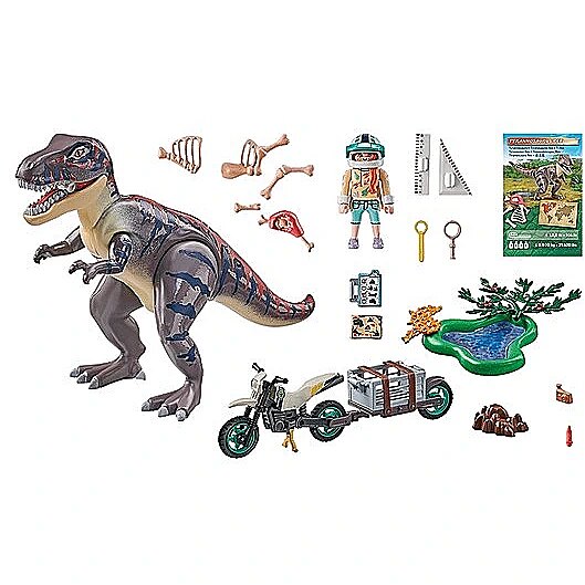Accessories included - Figures: 1 woman; Animals: 1 Tyrannosaurus rex; Accessories: 1 motorbike with trailer, 1 puddle with footprint, 1 branch, instruments for measuring, 1 clipboard, 1 pen, 1 spanner, 1 magnifying glass, 1 camera, 1 map, bones, excrements; 1 dinosaur knowledge card