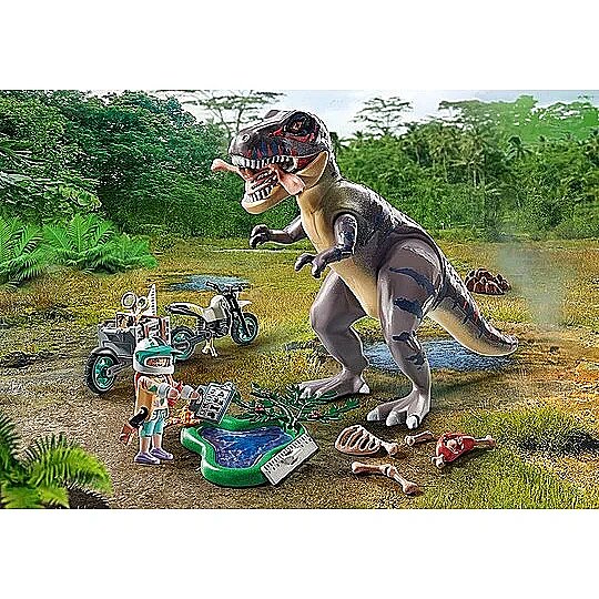 Description - The track of a T-Rex has been discovered! On her motorbike loaded with equipment, the researcher sets off looking for traces. Next to a footprint in a mud pot, she finds remains of its prey and a particularly large leaving. Includes a dinosaur knowledge card. Experience extra-large dino fun with the T-Rex from PLAYMOBIL. On her motorcycle with trailer, the researcher embarks on a quest to uncover traces of the Tyrannosaurus Rex. She succeeds and soon discovers bone fragments and a gigantic footprint. But when the original T-Rex suddenly appears before her, it's time to stay calm. The PLAYMOBIL Dinosaur World invites kids aged 4 and up to immerse themselves in exciting role-playing adventures and relive the fascination of these giant reptiles at home. Specifications: Cool PLAYMOBIL Dinosaur set featuring a PLAYMOBIL researcher, a Tyrannosaurus Rex, a motorcycle with trailer, a puddle with a footprint, a magnifying glass, camera, map, and additional research equipment. The T-Rex has movable arms, legs, and head, and an articulated jaw. Includes a knowledge card with fascinating dinosaur facts. All PLAYMOBIL Dino World sets are made of over 80% recycled and bio-based materials.