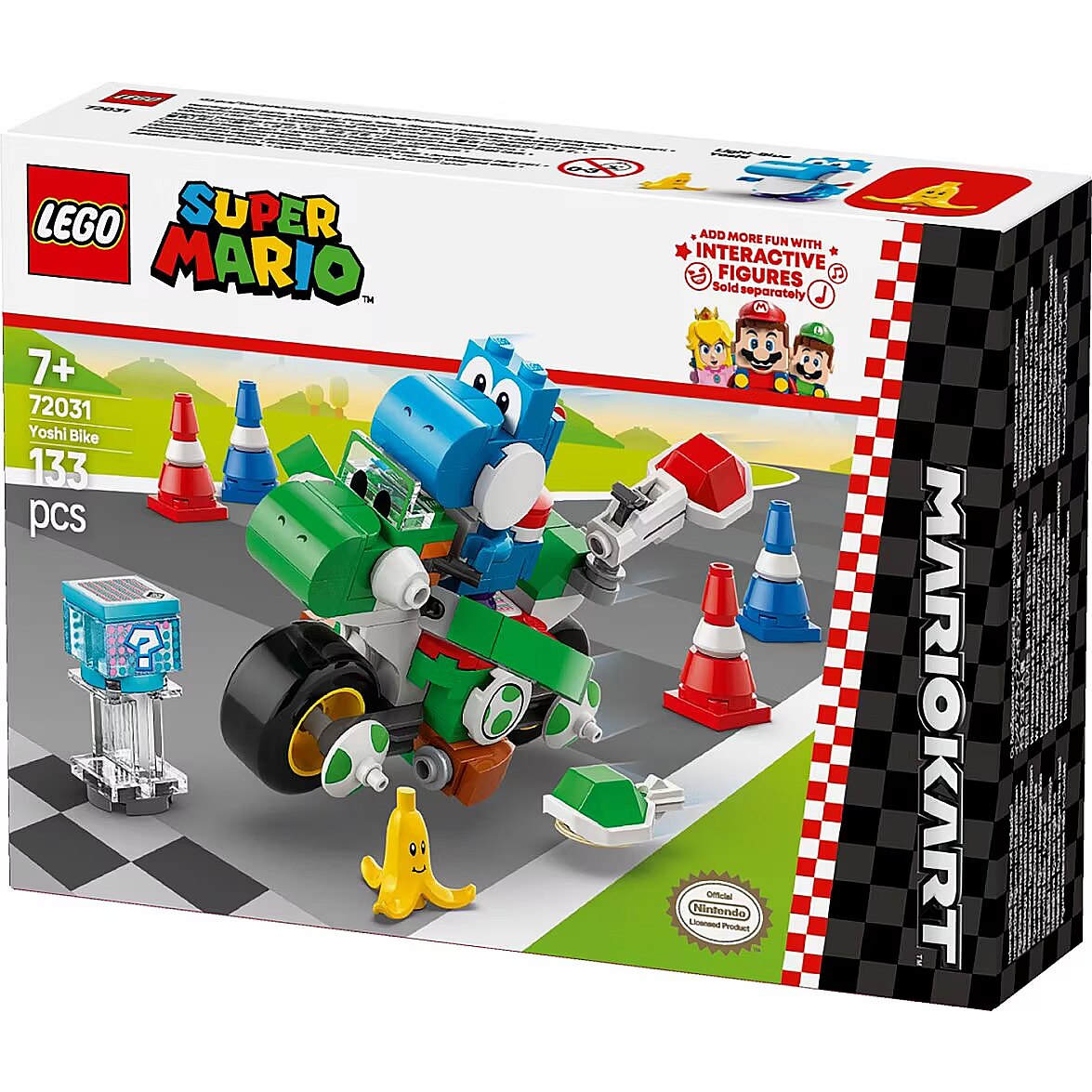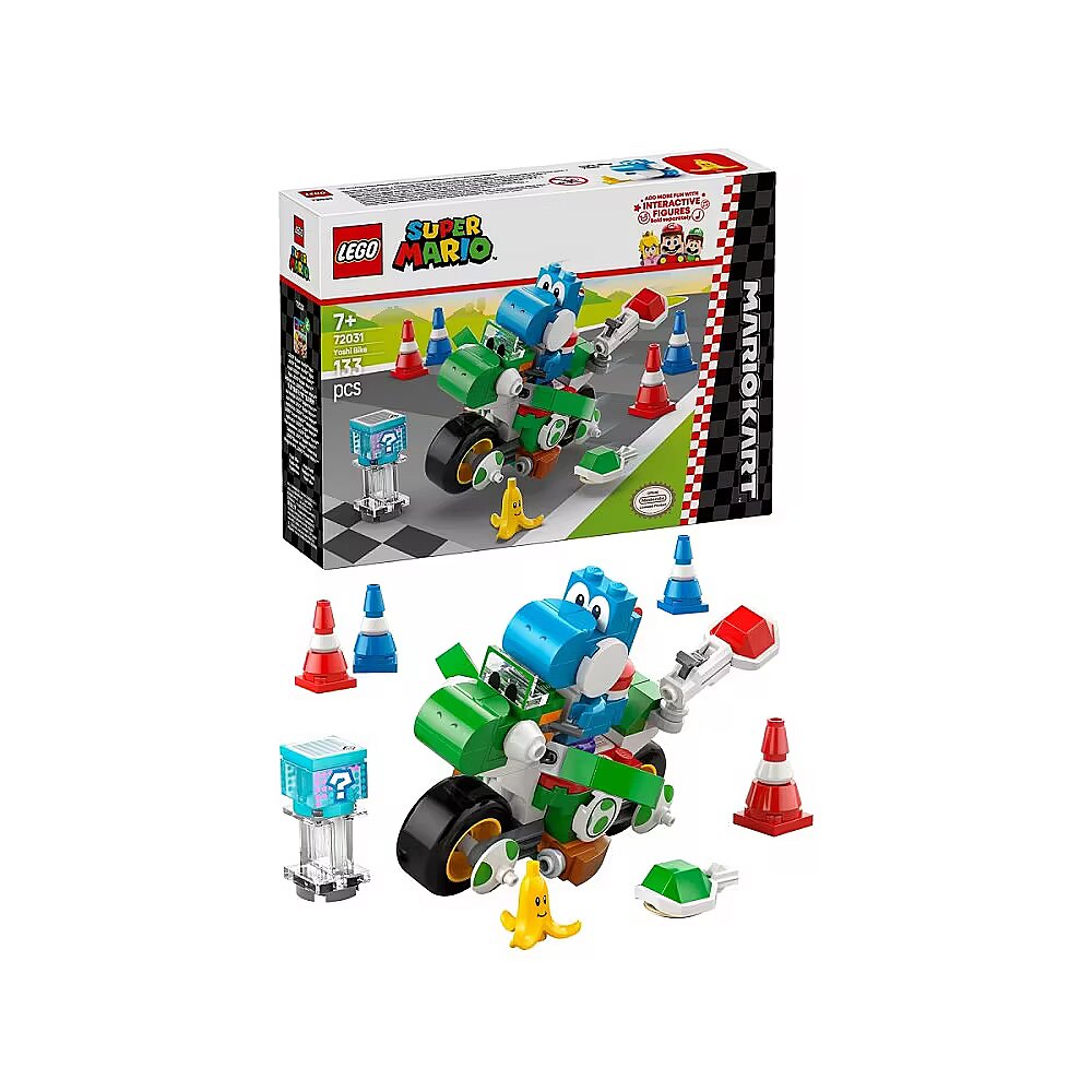 Description - Rev up for thrilling drive-and-drift action with this collectible LEGO Super Mario: Mario Kart Yoshi Bike adventure toy playset for kids (72031). An exciting Nintendo gift idea for boys, girls and gamers aged 7 and up, the set features a brick-built model of the Yoshi Bike and, for the first time in a LEGO Super Mario set, a Light-Blue Yoshi toy figure. Help Light-Blue Yoshi drive the bike between 4 traffic cones, launch shells from the bike and swerve around the Banana. Ride the bike with a LEGO Mario, LEGO Luigi or LEGO Peach  figure (from sets 71439, 71440 or 71441 sold separately) for interactive play, including sound effects for race starting, honking, drifting and hover mode, and look out for the Item Box which offers random digital items to use in the race. This LEGO Super Mario toy is great for independent play or as a social activity. Check out other LEGO Super Mario: Mario Kart sets (sold separately) in the assortment for more cool vehicles to race against. Nintendo  gift idea for kids Drive and drift on a brick-built model of the Yoshi Bike with this LEGO Super Mario: Mario Kart adventure toy playset Includes a Light-Blue Yoshi toy figure For the first time in a LEGO Super Mario set, find a Light-Blue Yoshi figure, plus a Banana element with face decoration Yoshi Bike toy Place Light-Blue Yoshi on the Yoshi Bike and drive between 4 traffic cones, launch shells from the bike and swerve around the Banana Interactive play Ride the Yoshi Bike with LEGO Mario, LEGO Luigi or LEGO Peach (figures not included) to trigger Mario Kart sound/visual effects and get digital items from the Item Box Fun birthday present for kids Gift this buildable playset to boys, girls and Nintendo gamers aged 7 and up; one of sets 71439, 71440 or 71441 (sold separately) is needed for interactive play Nintendo collectible Explore the full range of LEGO Super Mario: Mario Kart sets (sold separately) and find other vehicles to race against and characters to expand the role-play possibilities Inspire kids imaginations LEGO Super Mario playsets are designed for independent or social play, offering role play, digital coin-collecting and fun challenges through expansion and rebuilding Measurements The Yoshi Bike in this 133-piece playset measures over 2.5 in. (6 cm) high, 3.5 in. (9 cm) long and 1.5 in. (4 cm) wide