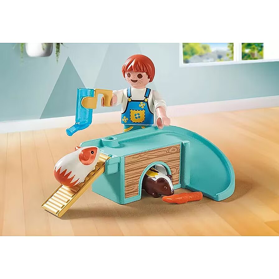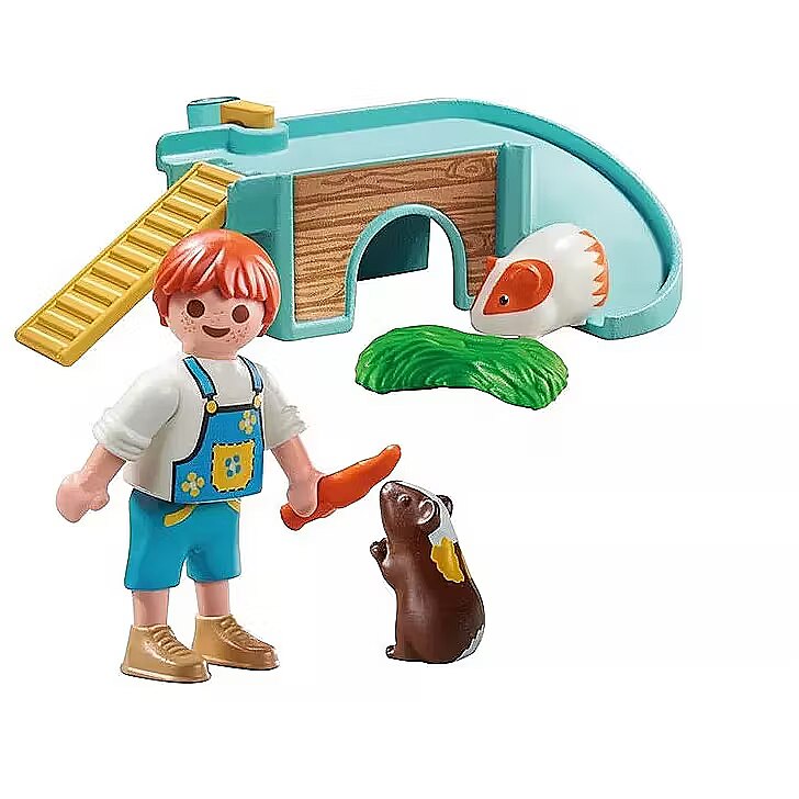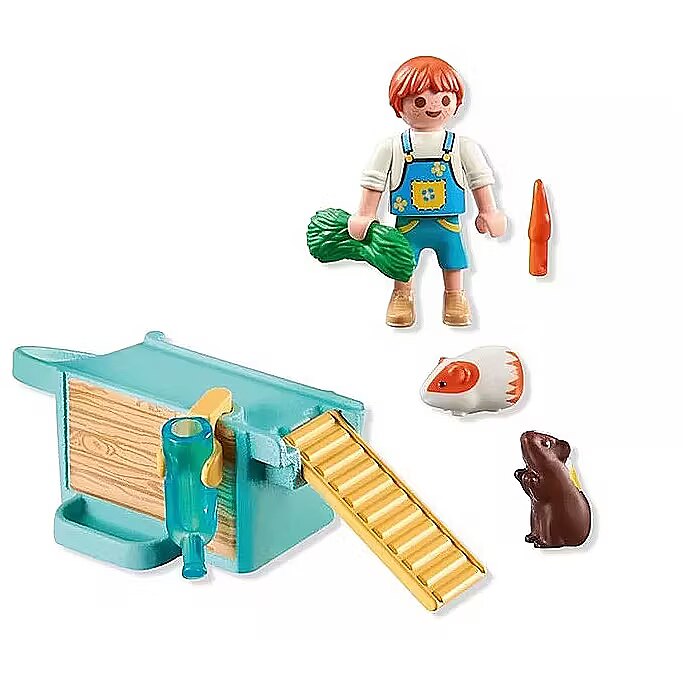 Description - Chłopiec troskliwie opiekuje się swoimi dwiema świnkami morskimi. Świnki morskie biegają i bawią się w swoim nowym przytulnym domku przeznaczonym dla gryzoni, wyposażonym w kryjówki, schody i butelkę z wodą! Chłopiec może karmić je marchewką lub kępkami trawy. Te milusińskie zwierzątka wnoszą mnóstwo uroku do każdej zabawy. Ten pełen przemyślanych detali zestaw PLAYMOBIL inspiruje do opieki i kreatywności, co czyni go niezbędnym dla dzieci kochających zwierzęta!