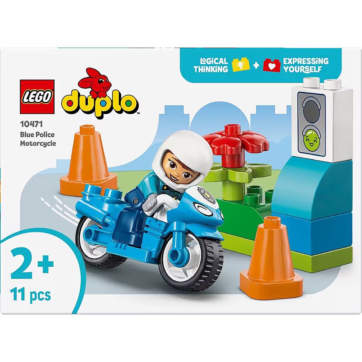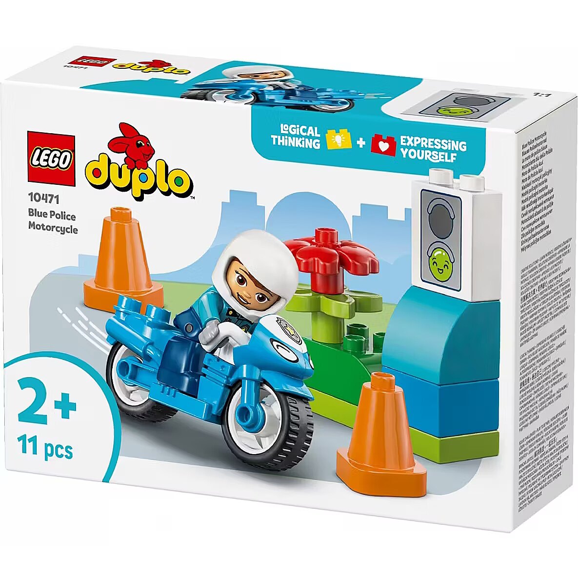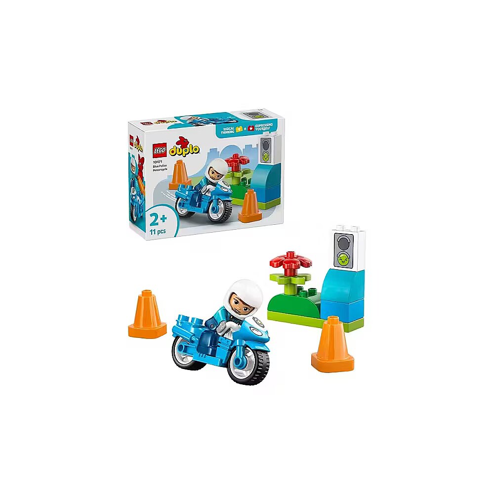 Description - Blocks DUPLO 10471 Blue Police Motorcycle The LEGO DUPLO My Town Blue Police Motorcycle (10471) playset offers a fun and engaging play experience for kids aged two and up. This educational toy lets little ones role-play stories about community service as a policewoman goes on patrol on her cool LEGO DUPLO motorcycle. This set makes a great birthday gift for kids aged two and up who love emergency vehicle toys. This small gift for toddlers includes a policewoman figure, bricks decorated with traffic lights, and two traffic cones.
