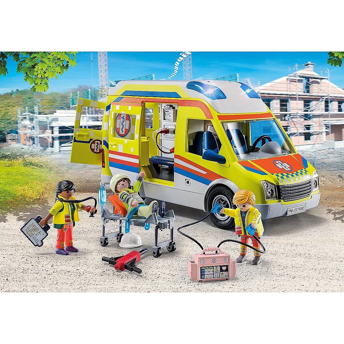 Accessories included - Figures: Paramedic Paramedic Wounded person Accessories: Ambulance with light and sound module Patient transport stretcher Infusion bag with infusion tube Defibrillator Documentation folder 3 x Diagnostic chart 3 x rail bandage Construction helmet Pneumatic hammer Head bandage 2 x plaster bandages Sheet of labels with bandage material Wrist watch Stethoscope
