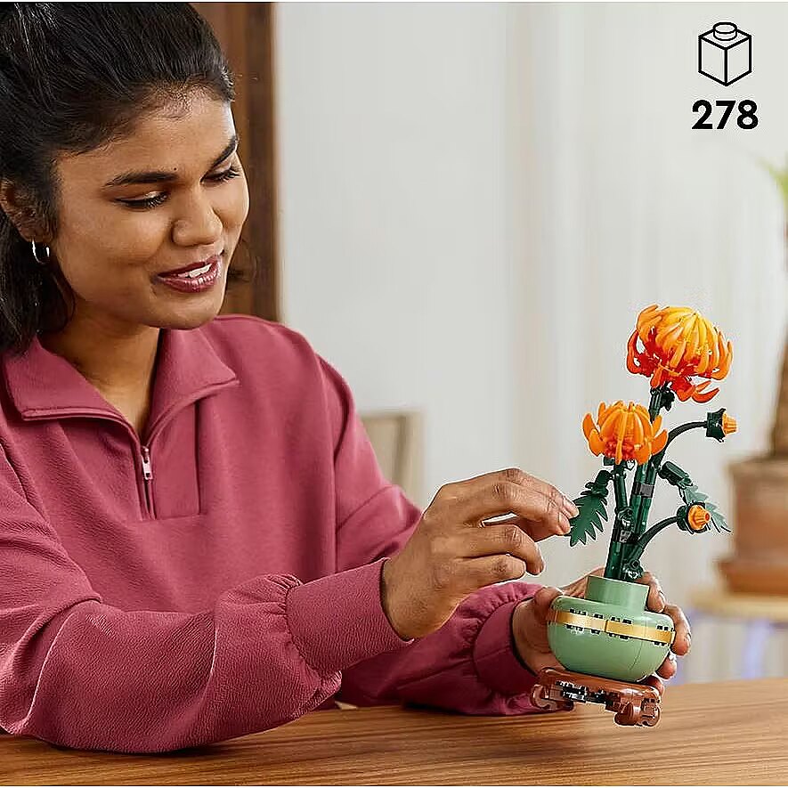 Description - Odpręż się przy zestawie dla dorosłych LEGO Icons Chryzantema (10368). Chryzantema to popularny motyw w sztuce tradycyjnej i symbol jesieni w klasycznym motywie artystycznym, opartym na czterech pięknych roślinach, znanych jako czworo szlachetnych. Rozpocznij ciekawy projekt lub podaruj ukochanej osobie ponadczasową kompozycję kwiatową jako na prezent na każdą okazję. Ta szczegółowa replika z ruchomymi liśćmi i płatkami przedstawia jaskrawopomarańczowy kwiat w formie pąka, rozkwitającego kwiatu i w pełni rozkwitu. Do zestawu dołączona jest pastelowa zielona doniczka ozdobiona złotą obwódką i cokołem z efektem drewna. Łatwy w budowaniu model chryzantemy stanowi elegancką ozdobę każdej przestrzeni i będzie się świetnie prezentować w towarzystwie innych zestawów z kolekcji botanicznej LEGO (sprzedawanych osobno). Odpręż się dzięki inspirującej serii kreatywnych zestawów LEGO dla dorosłych. Aplikacja LEGO Builder zawiera cyfrową wersję instrukcji budowania. Dekoracyjna chryzantema do zbudowania - spraw sobie przyjemność lub dołącz do przyjaciół i rodziny i weź udział w odprężającym projekcie dzięki zestawowi dla dorosłych LEGO Icons Chryzantema Zawartość zestawu - ten kreatywny zestaw zawiera wszystko, czego potrzeba do stworzenia chryzantemy i pastelowej zielonej doniczki ze złotą obwódką i cokołem z efektem drewna Kwitnące pąki - LEGO Icons Chryzantema z ruchomymi liśćmi i płatkami przedstawia jaskrawopomarańczowy kwiat w różnych etapach wzrostu, w tym w pełnym rozkwicie, w formie kwitnącego kwiatu i dwa pąki Ozdoba niewymagająca pielęgnacji - dodaj odrobinę koloru do swojego mieszkania lub biura dzięki chryzantemie w doniczce, której nie trzeba podlewać ani przesadzać Pomysł na prezent - uczcij urodziny lub inną wyjątkową okazję albo zaskocz ukochaną osobę prezentem dla dorosłych fanów zestawów LEGO, dekoracji wnętrz i kwiatów Zawiera cyfrowe instrukcje budowania - aplikacja LEGO Builder zawiera cyfrową wersję instrukcji do zestawu LEGO z kwiatkiem Część kolekcji botanicznej LEGO - zrelaksuj się przy szerokiej gamie zestawów LEGO zaprojektowanych specjalnie dla dorosłych Wymiary - chryzantema z doniczką i cokołem w tym 278-elementowym zestawie ma 26 cm wysokości, 10 cm szerokości i 9 cm głębokości.