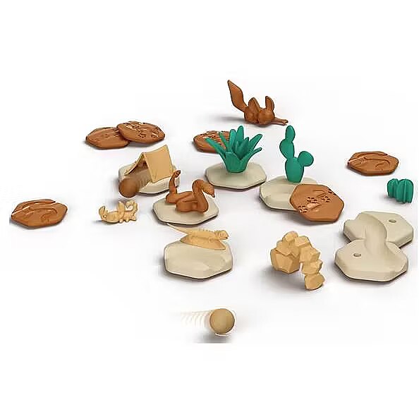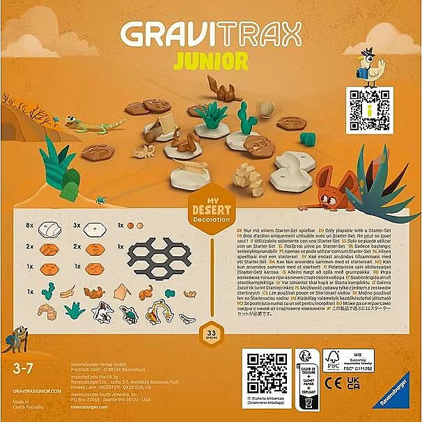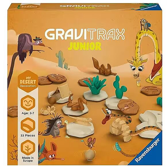 Description - GraviTrax Junior to interaktywny system torów kulkowych, zaprojektowany z myślą o najmłodszych. Odkryjcie siłę grawitacji, tworząc własne światy tematyczne, rozbudowując je i własnoręcznie dekorując! Zestaw uzupełniający Pustynia jest rozszerzeniem do dowolnego pakietu startowego GraviTrax Junior. Przeprojektuj swój tor, dodając do niego kolejną, niesamowitą krainę! Niech twoja plastikowa kuleczka mknie przez piaszczyste wydmy, pod skalnymi formacjami, pośród kaktusów! Spotkasz tu mnóstwo zwierząt, w tym fenka, węża i skorpiona. To miejsce tylko dla odważnych! Masz ochotę na więcej? Wszystkie zestawy GraviTrax Junior pasują do siebie, umożliwiając twórcze budowanie. Ogranicza cię tylko wyobraźnia!
