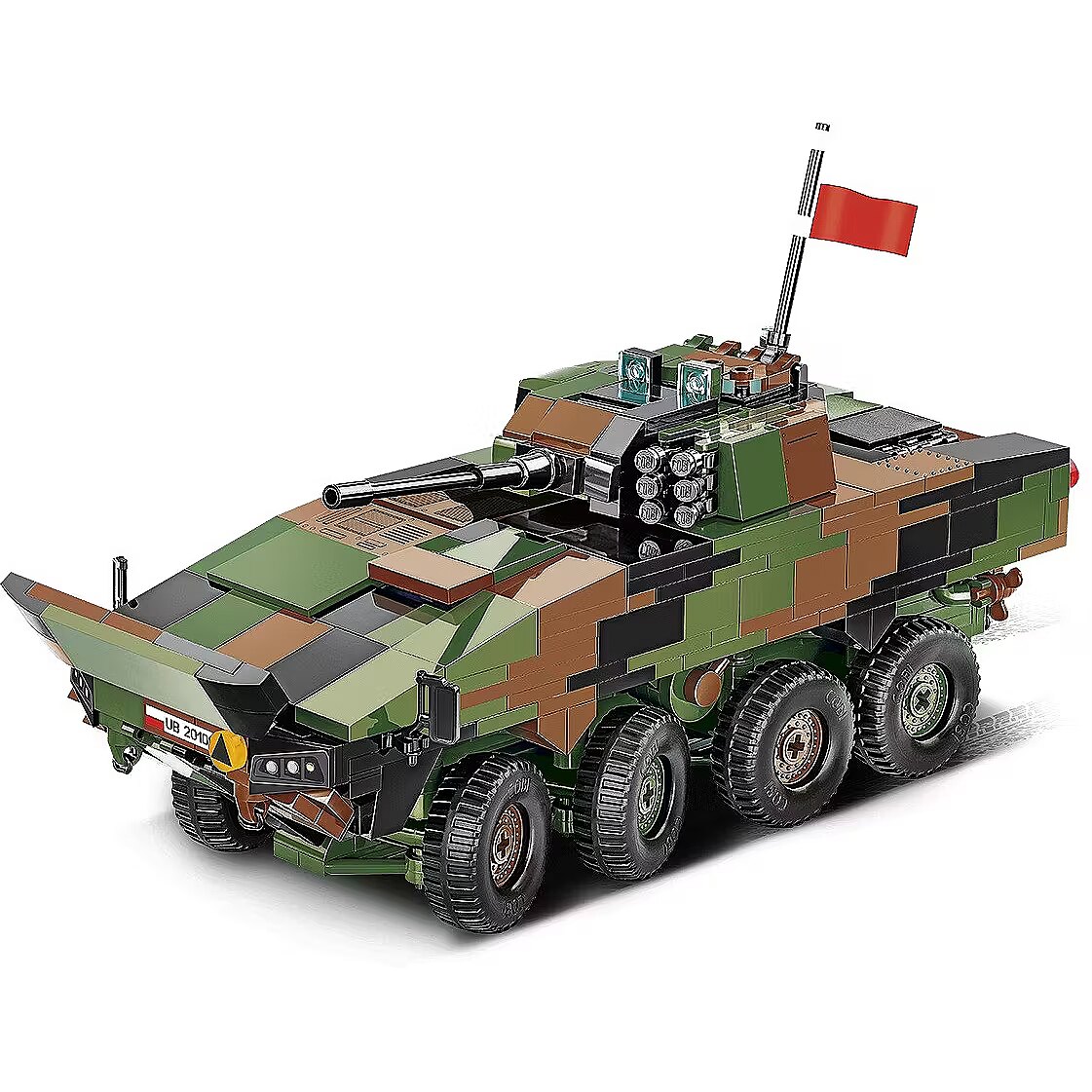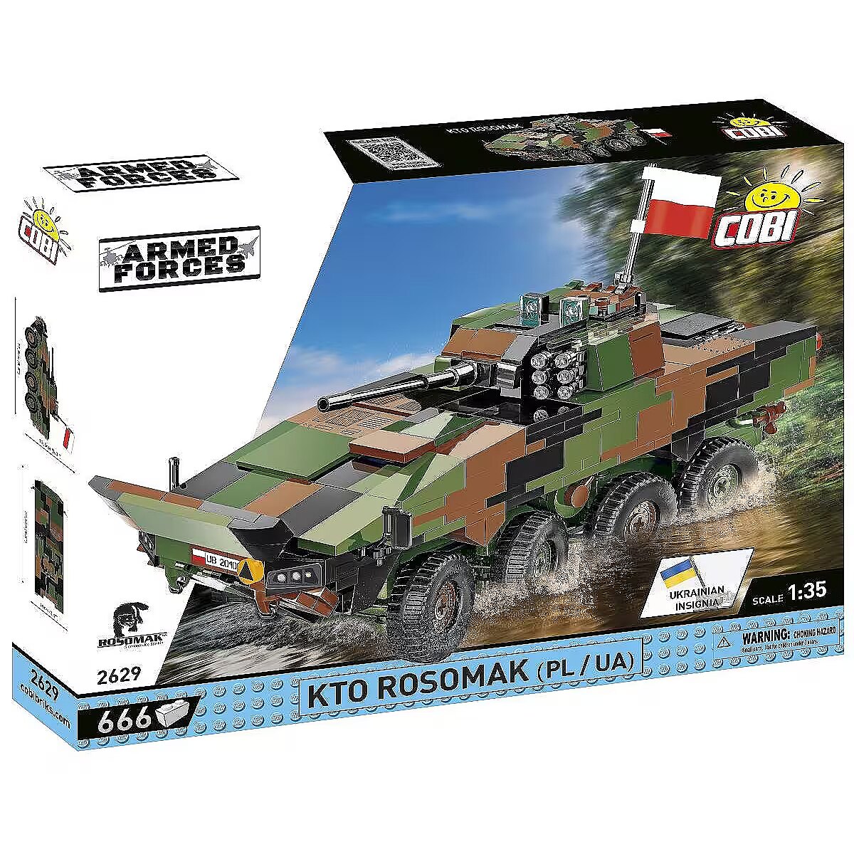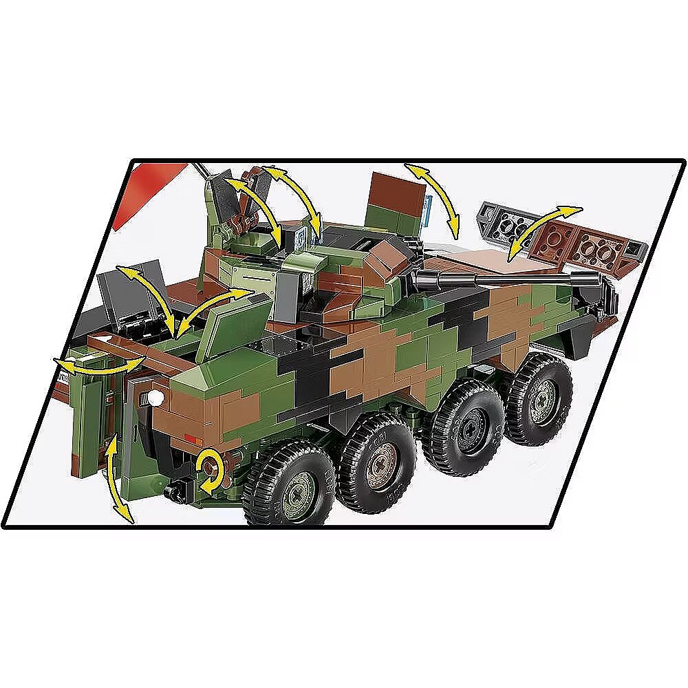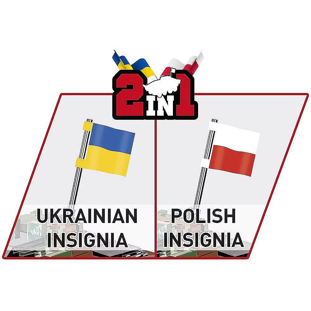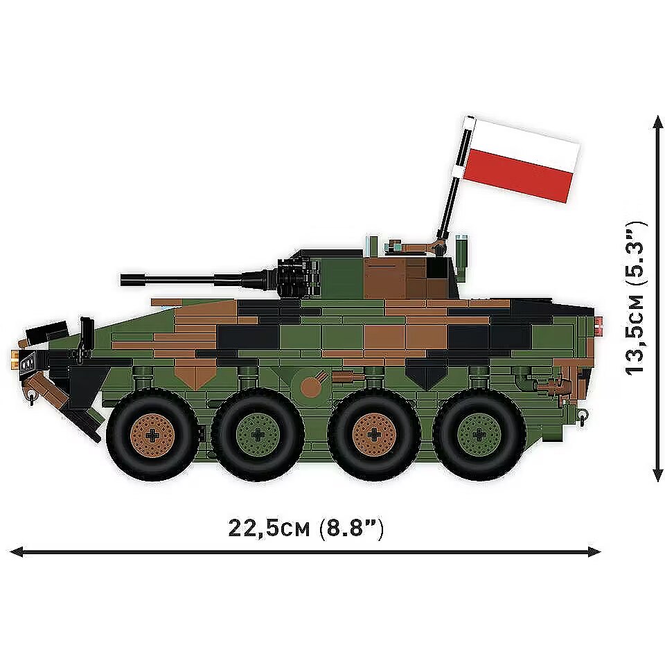 Klockowy model szczegółowo odwzorowany w skali 1:35 doskonale uzupełnia kolekcję pojazdów lądowych wydawanych w ramach serii COBI Armed Forces. Zestaw został wydany na licencji przedsiębiorstwa ROSOMAK SA z Siemianowic Śląskich, gdzie produkowany jest oryginalny pojazd! Model posiada skrętne osie kół, otwierane włazy oraz nadrukowane szczegółowe oznaczenia Wojska Polskiego. Do zestawu dołączone są również dwie klockowe flagi odpowiednio dla krajów, które użytkują tego typu pojazdy (Polska i Ukraina). Klockowa tabliczka zawiera nadrukowaną nazwę pojazdu i można ją wyeksponować obok modelu! Zbuduj współczesny transporter kołowy Wojska Polskiego! Wyprodukowane w UE przez firmę z ponad 35-letnią tradycją Spełniają normy bezpieczeństwa dotyczące produktów dla dzieci W pełni kompatybilne z innymi markami klocków konstrukcyjnych Zastosowano tylko trwałe nadruki bez użycia naklejek Czytelna i intuicyjna instrukcja oparta na rysunkach i ikonach Skala 1:35
