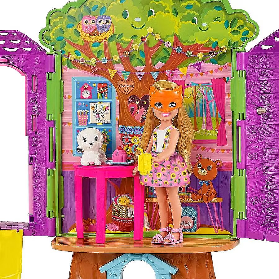 Description - Barbie Chelsea doll and tree house with puppy Children can explore a world full of games and discovery in the treetops with this Barbie Chelsea inspired tree house set. It includes over 10 storytelling elements and five different play elements for the Chelsea character. From creating a fox mask and pretending, to slithering up a tree branch when you reach the ladder, there's plenty of fun waiting for her! The doll cannot stand alone. Colours and decorations can happen. This Barbie treehouse set includes a Chelsea doll, puppy and adorable accessories for lots of imaginative fun! Chelsea doll is ready for a day of fun in a cute dress and floral shoes. Open the swinging door to the treehouse and send her up the ladder to get the adventure started! Open up the sides of the treehouse to reveal multiple play areas, or close it up for easy storage. There's even a puppy kennel in the tree trunk! Colourful storytelling elements add to the fun. Chelsea doll can play on the slide and swing, dress up in animal masks, enjoy a sweet snack and watch the stars through the telescope! Chelsea's sets include cute dolls and adorable details that will make a great gift for children aged 3 and up. Each sold separately, subject to availability.