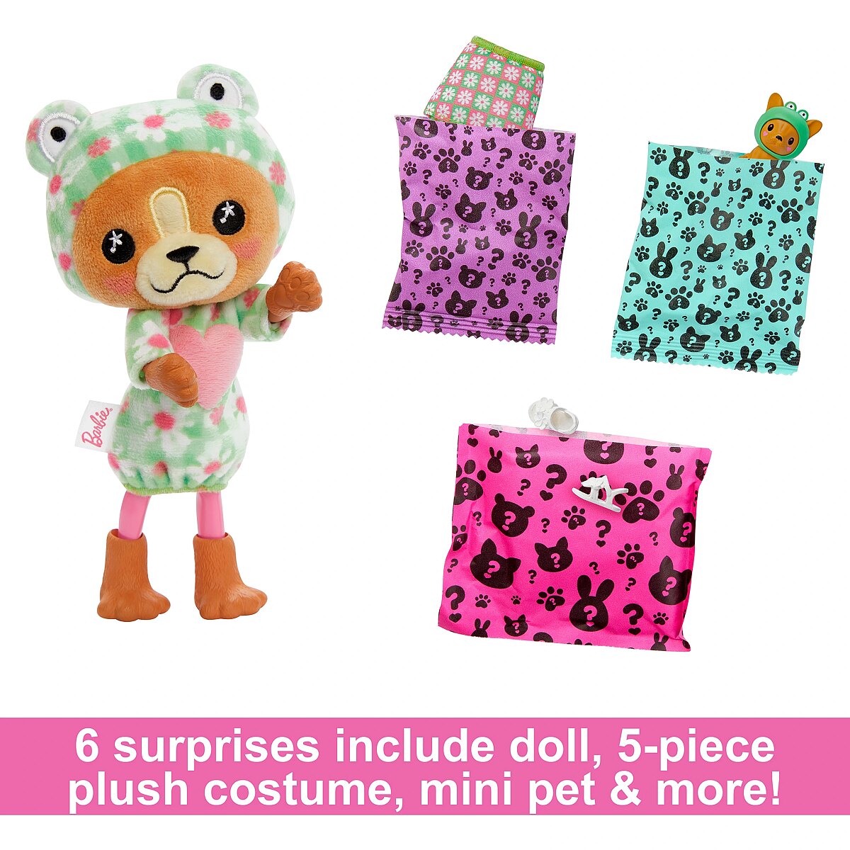 Description - Barbie Cutie Reveal costume-themed series Chelsea dolls offer the cutest unboxing experience with six surprises! Discover a Kitten in a Red Panda costume, a Dog as a Frog, a Teddy Bear as a Dolphin or a Bunny as a Koala. Remove the plush costume to reveal a Chelsea doll. Which doll will you reveal? Get cozier with more surprises like a skirt and mini pet that matches the doll's costume. Flip the plush top for an over-sized jacket and the costume head for a pet bed. Icy cold water adds even more cuteness with color-change transformation on the mini pet; warm water changes it back for repeat fun! Kids will love discovering all the surprises in this cozy cute Barbie Cutie Reveal series. Each doll sold separately, subject to availability. Dolls cannot stand alone. Colors and decorations may vary.