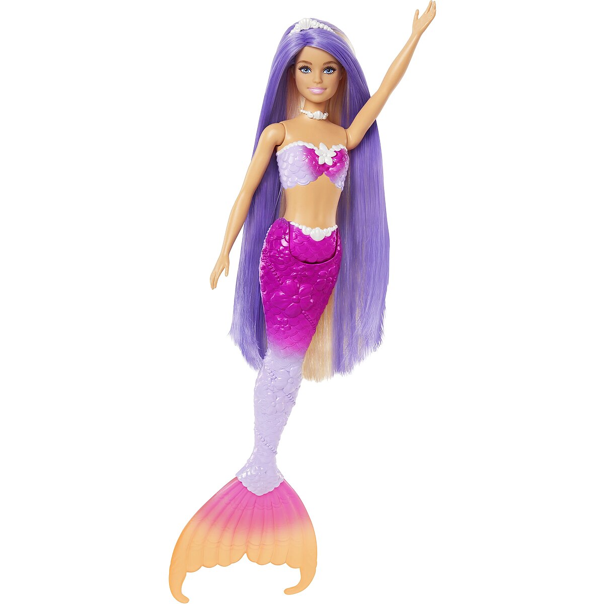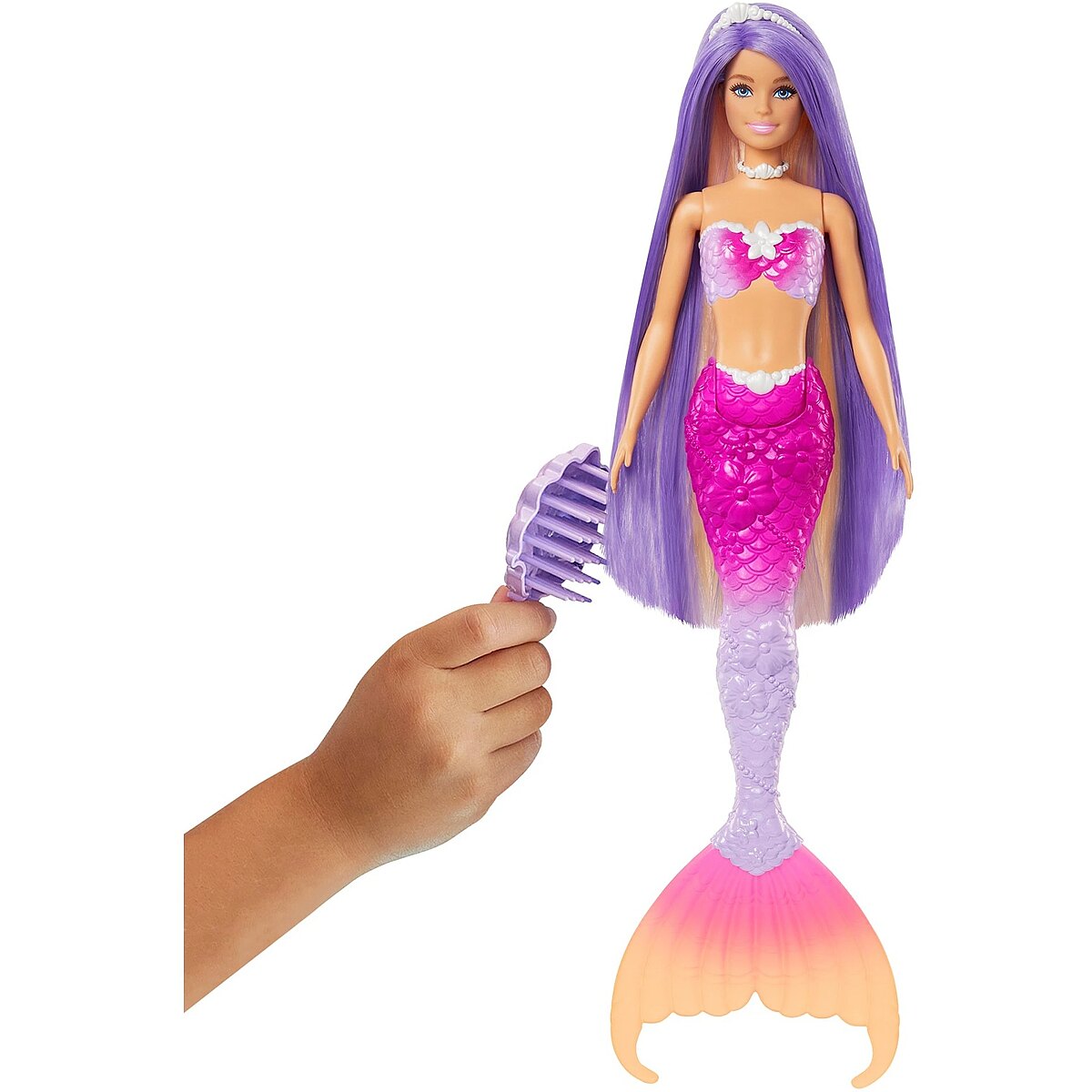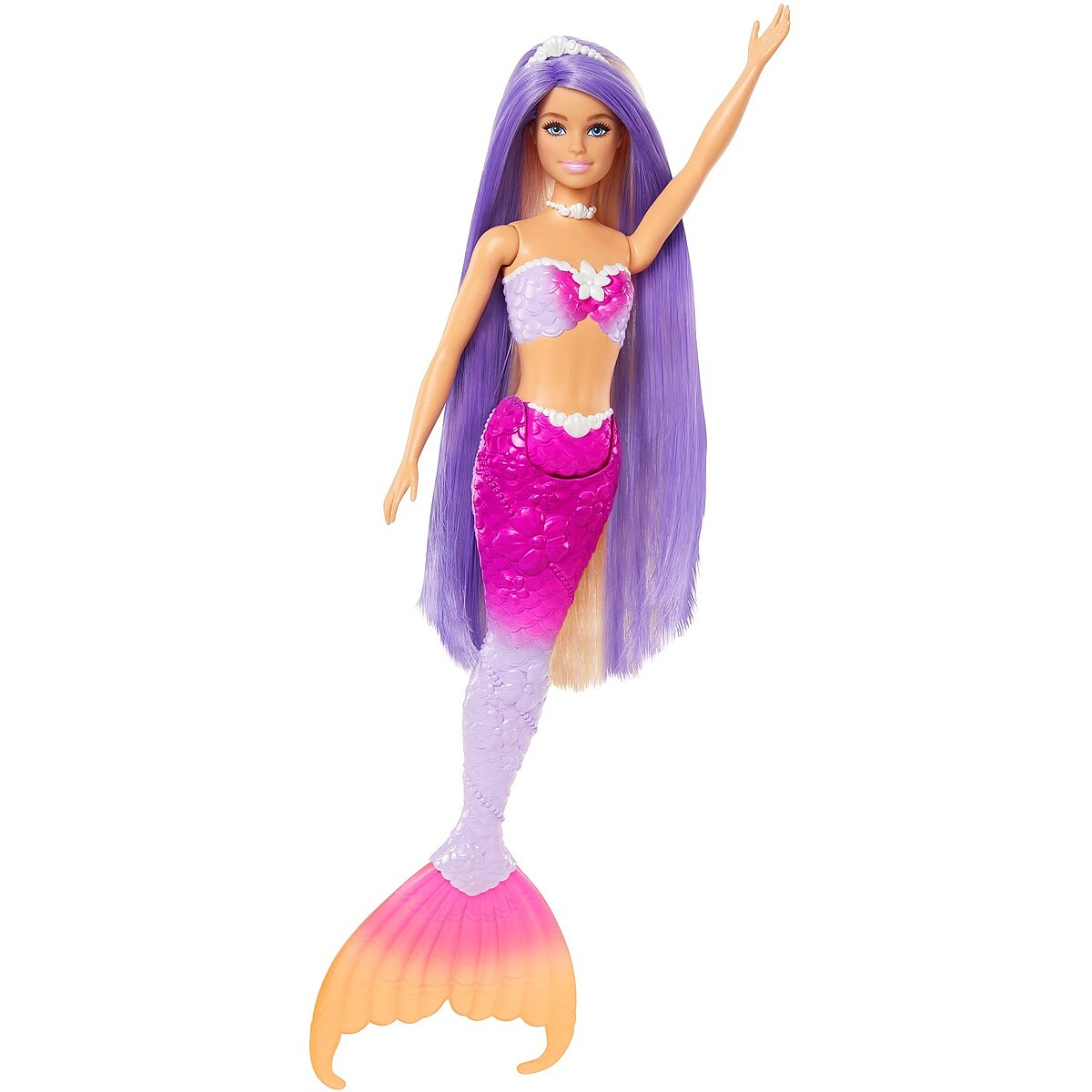 LongDesc - This mermaid Barbie doll transforms playtime into pure magic with her colour change features! As if enchanted by undersea powers, the mermaid's super long hair, sculpted bodice, and ombre tail turn from bubblegum pink to vibrant purple and back again. Barbie 'Malibu' comes with styling accessories, a brush, and an adorable pet, making her a fantastical gift for kids ages 3 years old and up! Doll cannot swim or stand alone. Colours and decorations may vary.