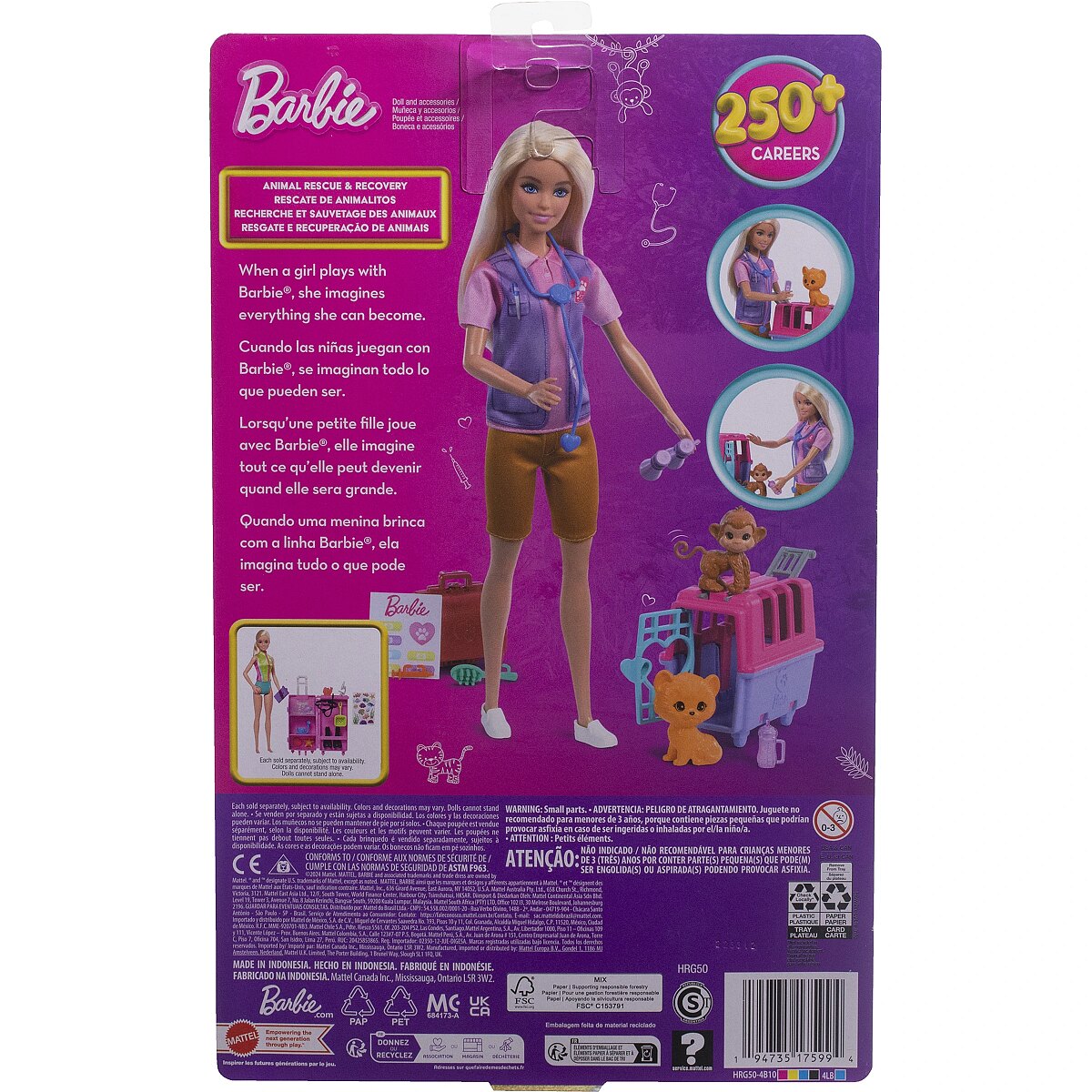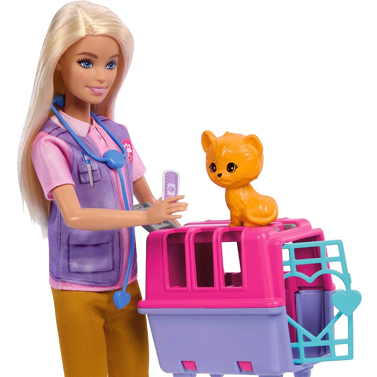 Technical_details - Barbie always cares about animals - and with this animal rescue playset she's fully equipped! With a monkey and a tiger cub, she has two cute patients to rescue and care for. Accessories such as a doctor's bag, an animal transport box with a functioning door, a heart-shaped stethoscope, a feeding bottle and a syringe help her with this. Barbie wears a practical outfit with a chic, purple top and shorts. Item no.: 100025588 Kind of doll EAN 0194735175994 Manufacturer no. HRG50 Barbie Careers Series Contents/equipment Barbie animal rescue doll with various accessories: animal transport box, doctor's bag, stethoscope, feeding bottle, syringe, bathtub, towel, food bowl, brush, binoculars, radio, sticker sheet Age recommendation from 36 months Target group of kindergarten children Material: Plastic Warnings Warning: Not suitable for children under 36 months! Caution: Danger of suffocation due to small parts that can be swallowed! Dimensions width: 70 mm x height: 298 mm x depth/length: 34 mm