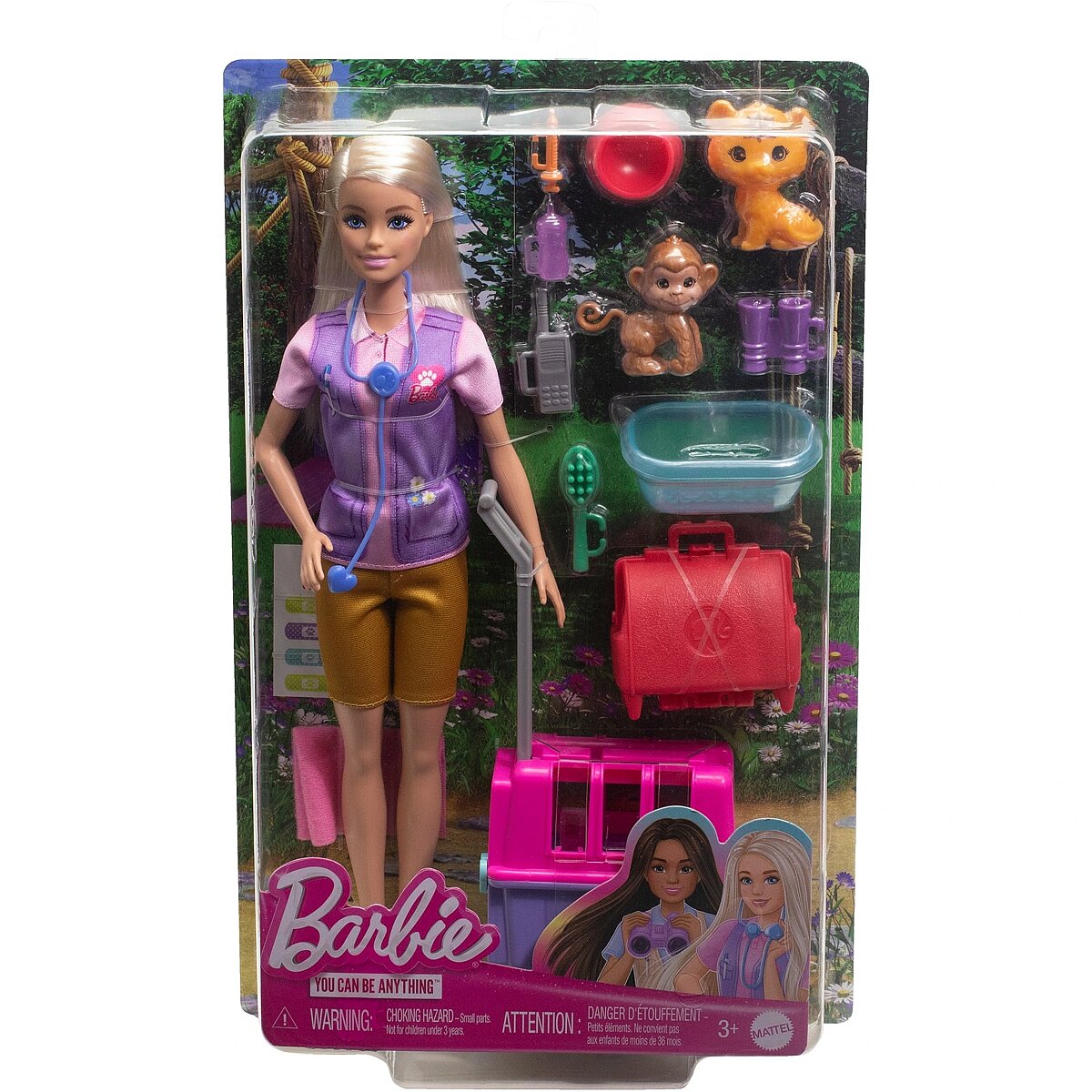 Packaging content - Packaging content - Includes 1 Barbie doll wearing removable top, shorts, shoes and stethoscope, plus 1 monkey figure, 1 tiger figure, 1 animal carrier, 1 medical bag, 1 bathtub, 1 towel, 1 syringe, 1 bottle, 1 feeding bowl, 1 brush, 1 set of binoculars, 1 radio and 1 sticker sheet.