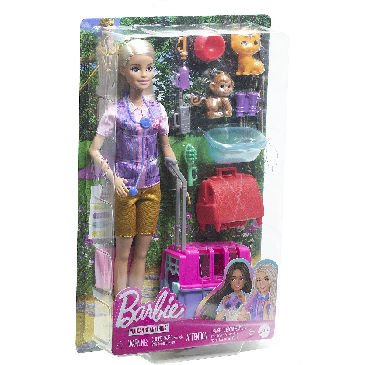 LongDesc - The Barbie Animal Rescue and Release doll and playset let kids bring the outdoors in and explore exciting career possibilities! Barbie animal rescuer doll has two adorable patients to rescue and care for -- a baby monkey and tiger -- and lots of accessories to help. With items like an animal carrier, doctor's bag and more, Barbie doll takes kids on wild adventures and encourages young minds to dream big. Doll cannot stand alone. Colours and decorations may vary.