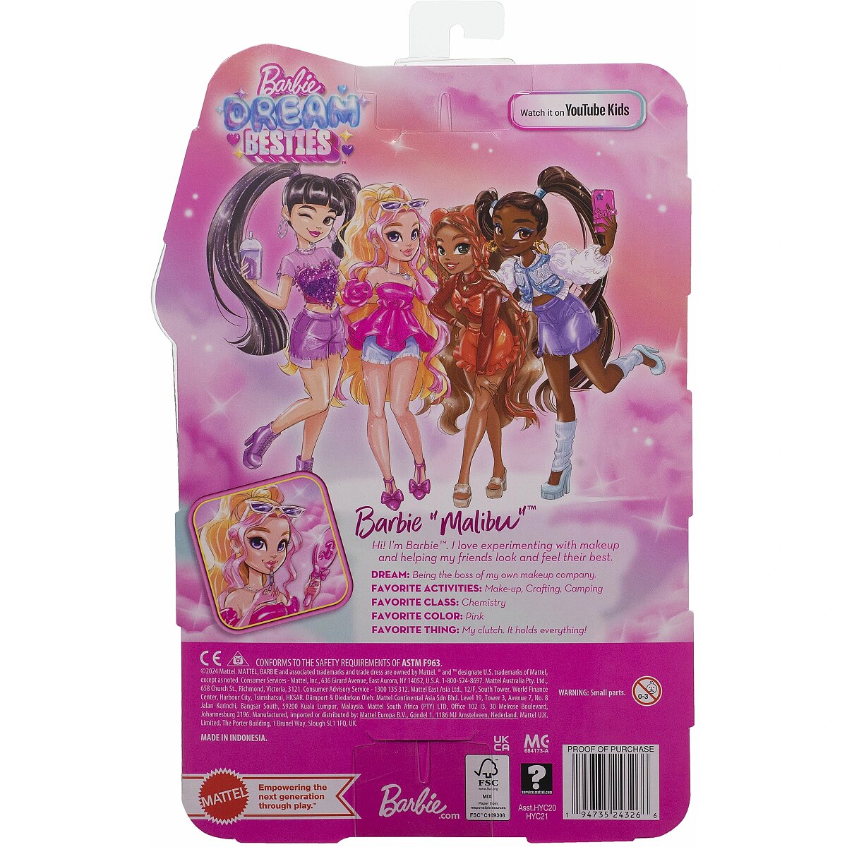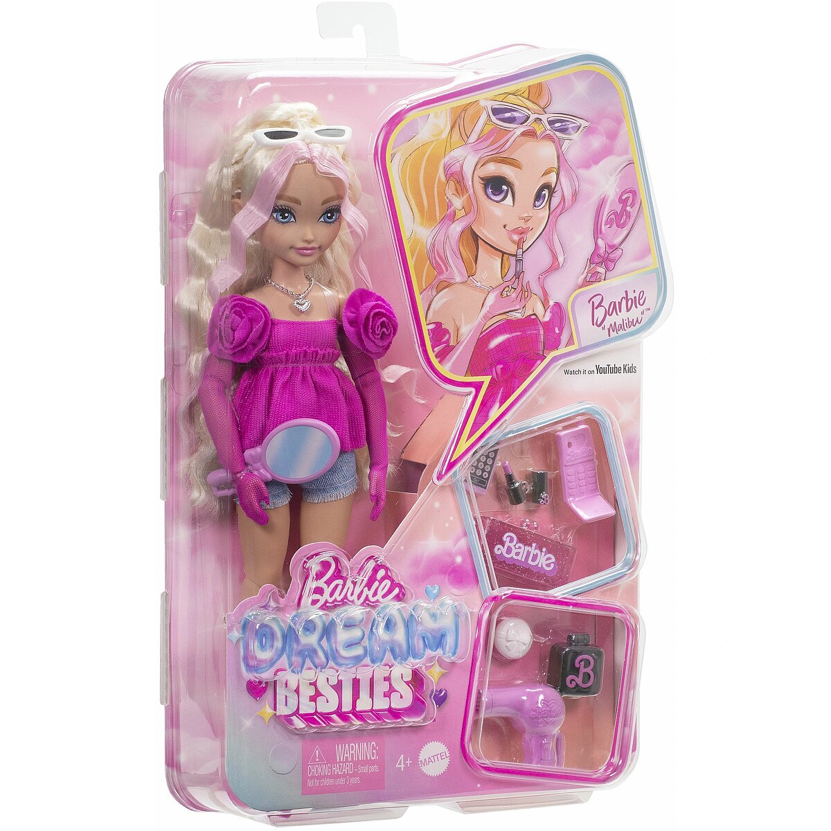 LongDesc - The Barbie Dream Besties dolls encourage kids to share their unique talents with the world, just like Barbie 'Malibu'! Barbie 'Malibu' has dreams of owning her own makeup company help her chase her dreams with 11 different beauty-themed accessories, including a hairdryer, mirror and lipstick! The fashion doll also has long blonde, wavy hair for styling fun. The Barbie Dream Besties dolls inspire kids ages 4 years old and up to live out their dreams. Doll cannot stand alone. Colours and decorations may vary.