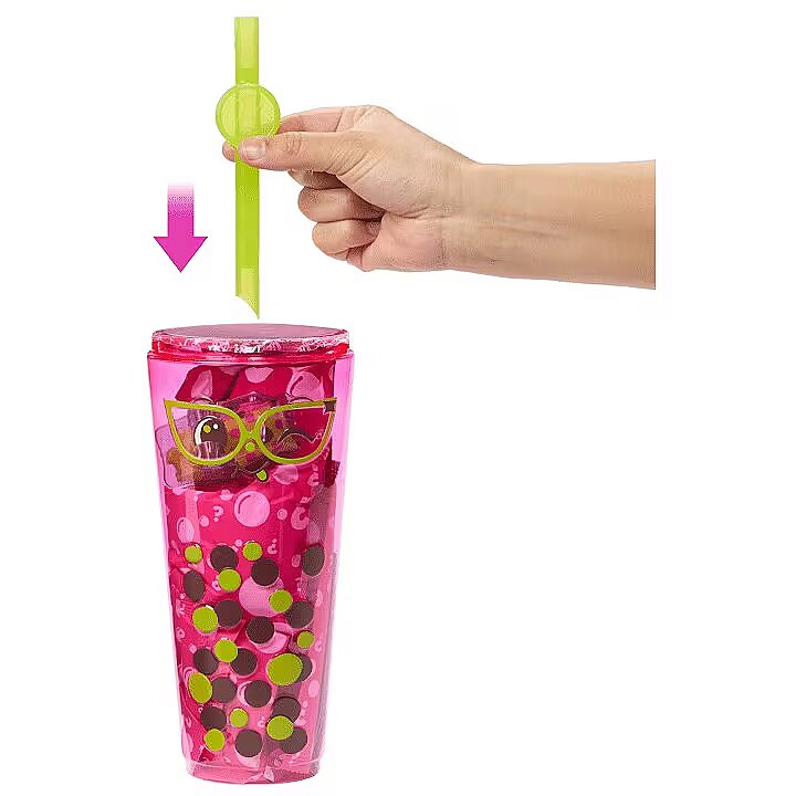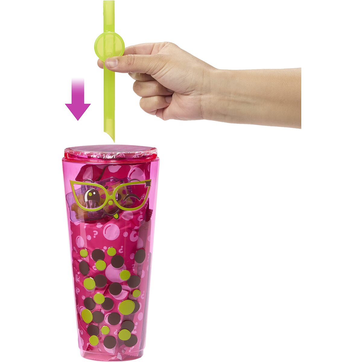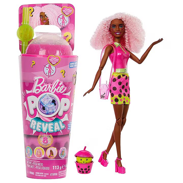 LongDesc - Barbie Pop Reveal Bubble Tea Series dolls offer a sensory unboxing experience with eight surprises! Unscrew the lid with the Slime and poke through the film with the straw for squishy fun. Peel the film on the cup to reveal a bubble tea-scented Barbie doll and eight more surprises! Which doll will you reveal? There's Taro Milk, Berry Bliss, Green Tea or Mango Mochi. Continue unboxing to discover two reusable ice cubes that pop open to reveal a skirt and pair of shoes. Mystery bags reveal a straw, a purse and a squishy, scented matching pet! Discover more wow with colour-change transformations on Barbie doll's face. Kids will want to collect them all! Each doll sold separately, subject to availability. Dolls cannot stand alone. Colours and decorations may vary.