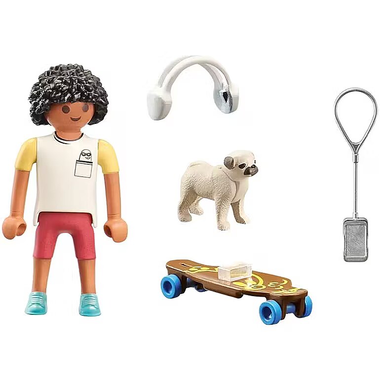 Whether skateboarding or going for a walk, the dog is always by his friend's side! Lovingly designed PLAYMOBIL playset featuring one PLAYMOBIL figure, a dog, and a skateboard for creative role-playing.