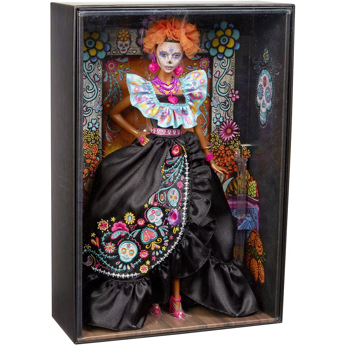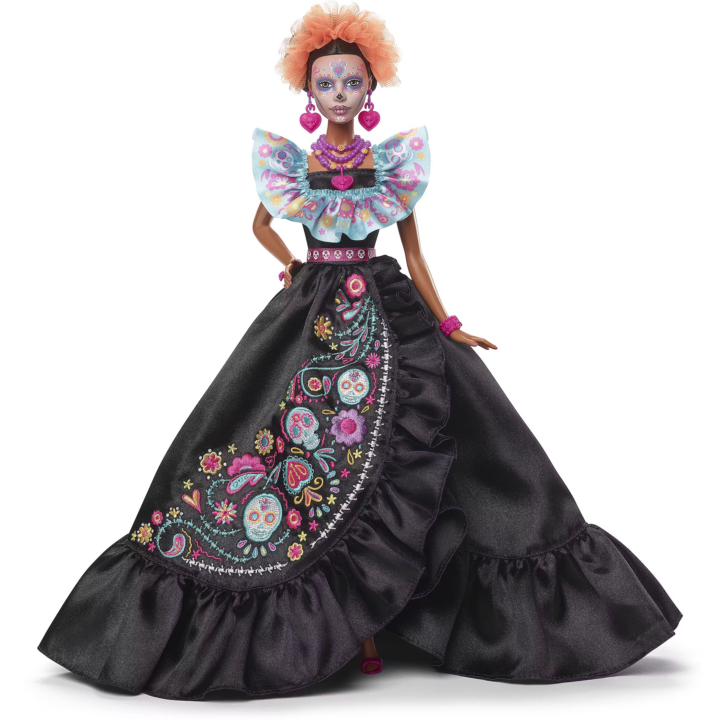 LongDesc - The Barbie Día De Muertos series honors the customs, symbols and rituals often seen throughout this festive time of remembrance. Barbie doll is a sight to behold in a beautiful black dress complemented by ruffles and embroidery-inspired artwork. A 'marigold' headpiece and statement jewelry frame her stunning calavera face paint. May the 2024 Día De Muertos Barbie doll become a treasured keepsake and holiday tradition! Includes doll stand and Certificate of Authenticity. Doll cannot stand alone. Colours and decorations may vary.