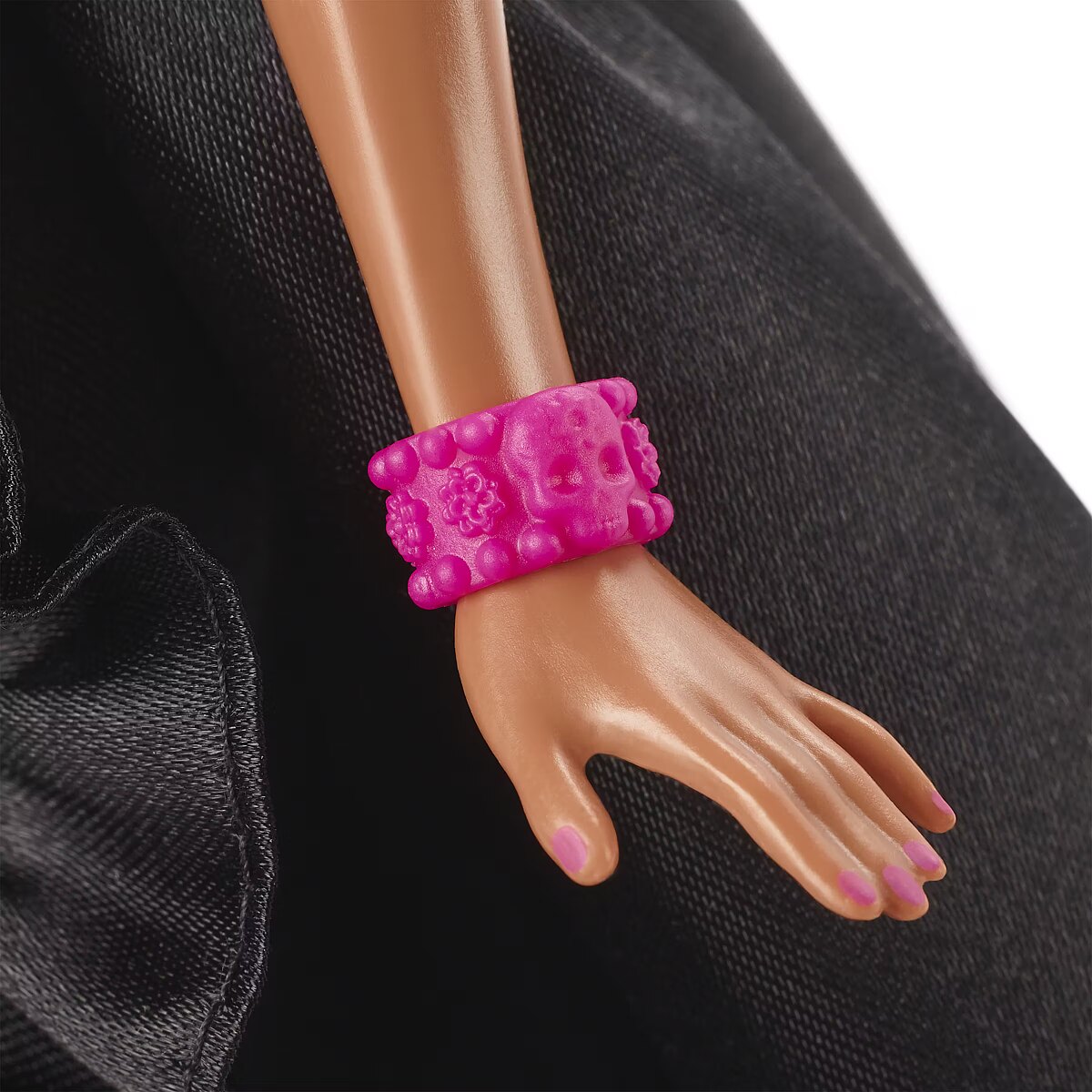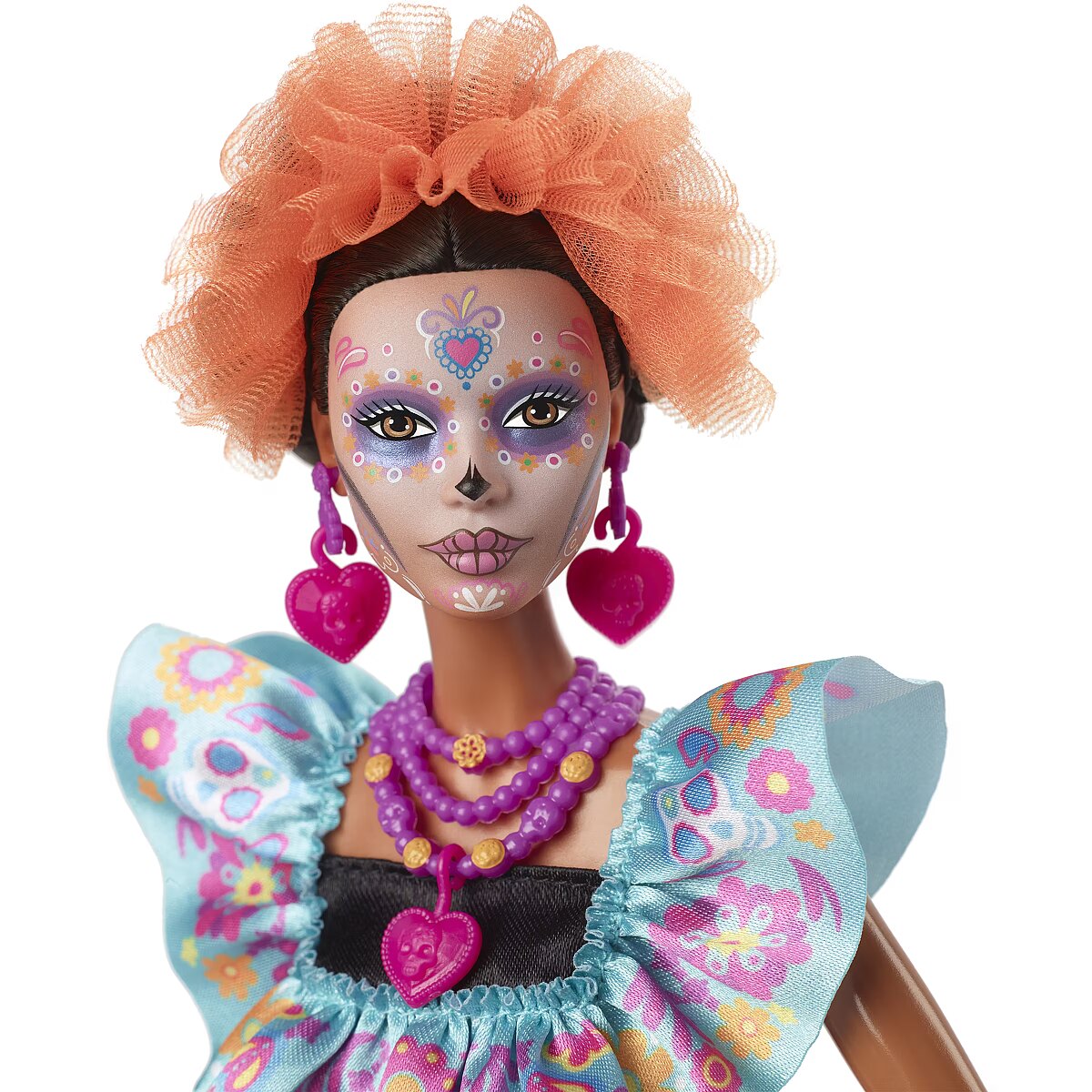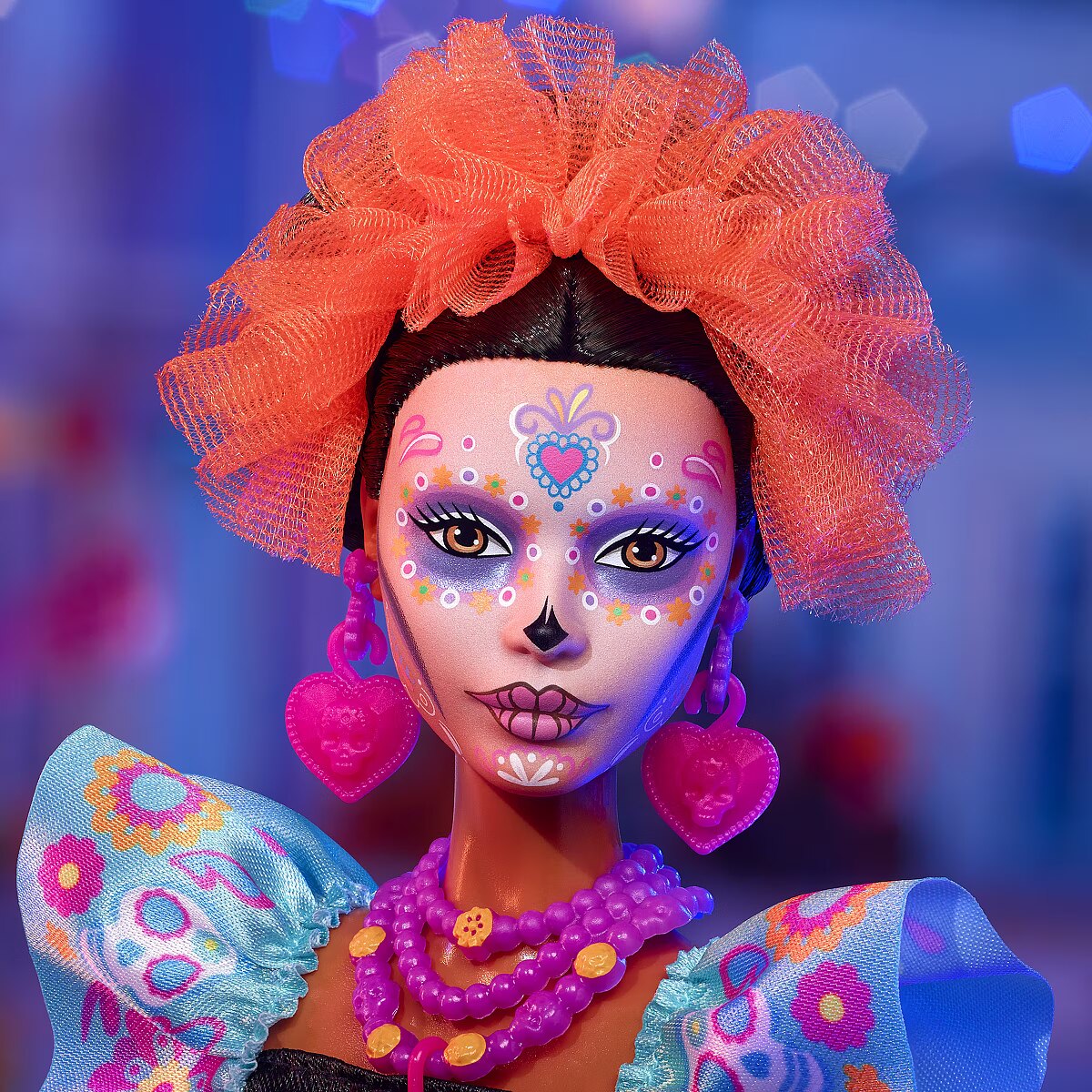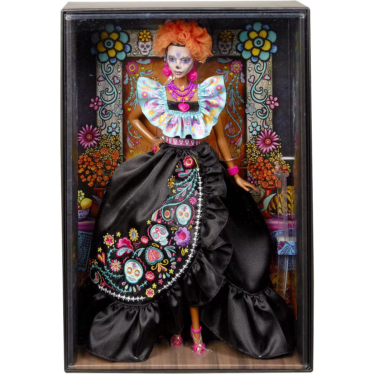Description - Barbie Signature Día De Muertos 2024 The Barbie Día De Muertos series honors the customs, symbols and rituals often seen throughout this festive time of remembrance. Barbie doll is a sight to behold in a beautiful black dress complemented by ruffles and embroidery-inspired artwork. A "marigold" headpiece and statement jewelry frame her stunning calavera face paint. May the 2024 Día De Muertos Barbie doll become a treasured keepsake and holiday tradition! Includes doll stand and Certificate of Authenticity. Doll cannot stand alone. Colors and decorations may vary. Barbie continues its Día De Muertos series in 2024 with a lovingly designed doll. Her festive fashion is infused with references to the traditions, symbols, and rituals of this time-honored holiday. Barbie doll's satiny black dress is accented by a sky-blue ruffled bodice and rose-pink ribbon belt. Vibrant "embroidery" of bones, flowers, and sugar skulls bloom across the top and skirt. Her headpiece is made of gathered fabric and mimics the shape of marigold petals. Its rich orange hue beautifully complements the shimmering lilac color in her traditional calavera face paint. Sugar skull corazón earrings, a chunky candy-colored necklace, and a pink flower ring add an extra dash of sweetness to her holiday look. The 2024 Barbie Día De Muertos doll comes in gorgeously illustrated packaging that is perfect for display and gifting. May she bring joy to your household as you celebrate the memories of loved ones!