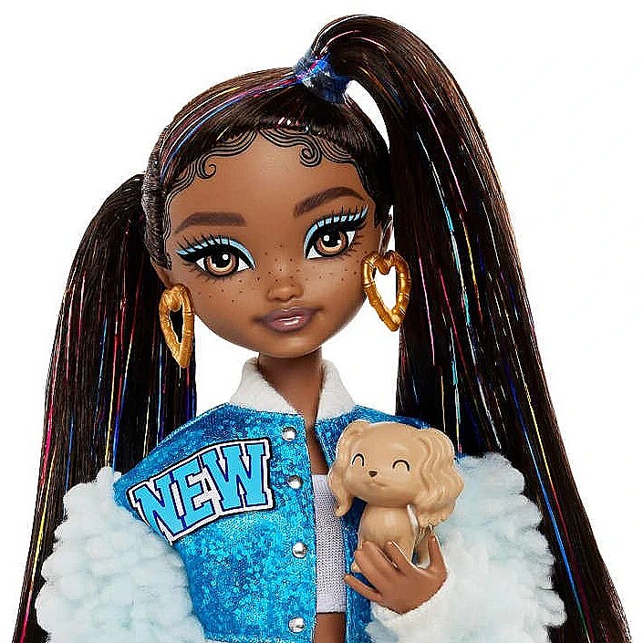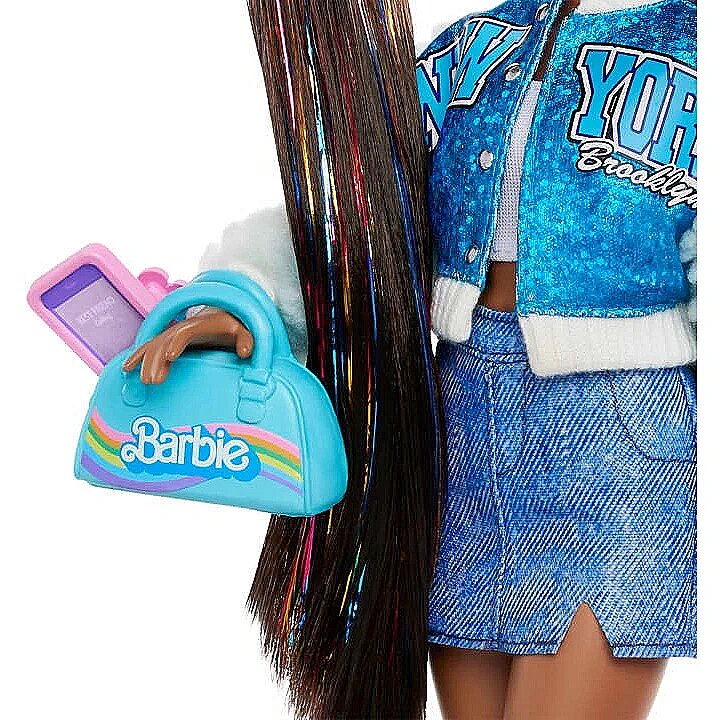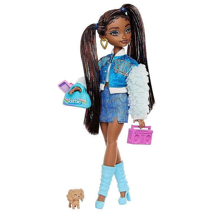 Accessories included - Lalka Barbie Dream Besties "Brooklyn w kurtce, dżinsowej spódniczce, getrach i bucikach Lampa pierścieniowa Tablet Komórka Etui na komórkę Boombox Figurka szczeniaczka Torba sportowa Akcesorium