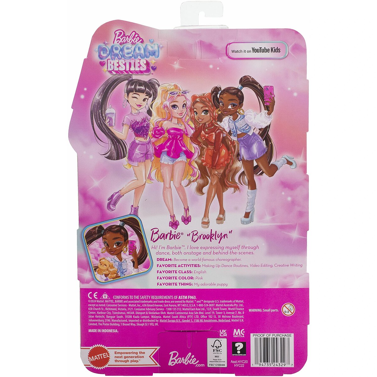 LongDesc - The Barbie Dream Besties dolls encourage kids to share their unique talents with the world, just like Barbie 'Brooklyn'! Barbie 'Brooklyn' has dreams of becoming a world-famous choreographer - help her create her routines with accessories like a tablet, phone and boombox. The fashion doll includes her long black hair, styled in multiple ponytails with shiny highlight accents for hairstyling fun. The Barbie Dream Besties dolls inspire kids ages 4 years old and up to live out their dreams. Doll cannot stand alone. Colours and decorations may vary.
