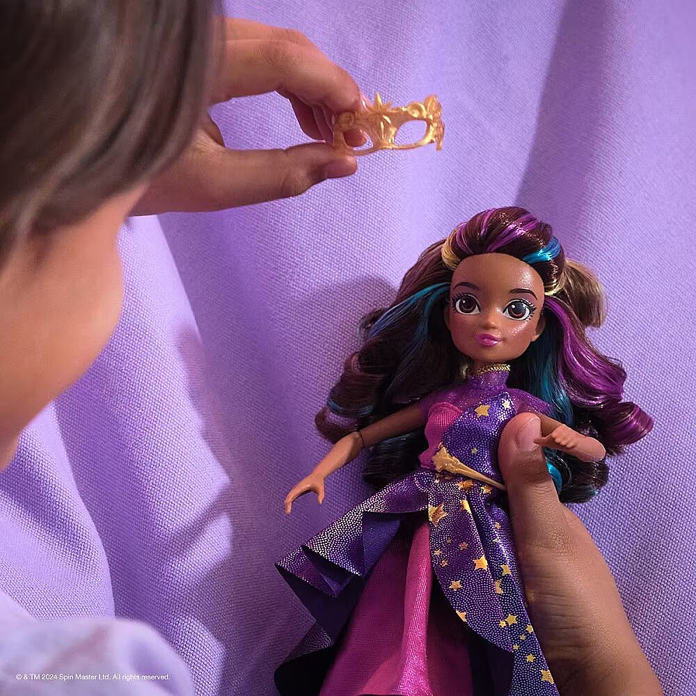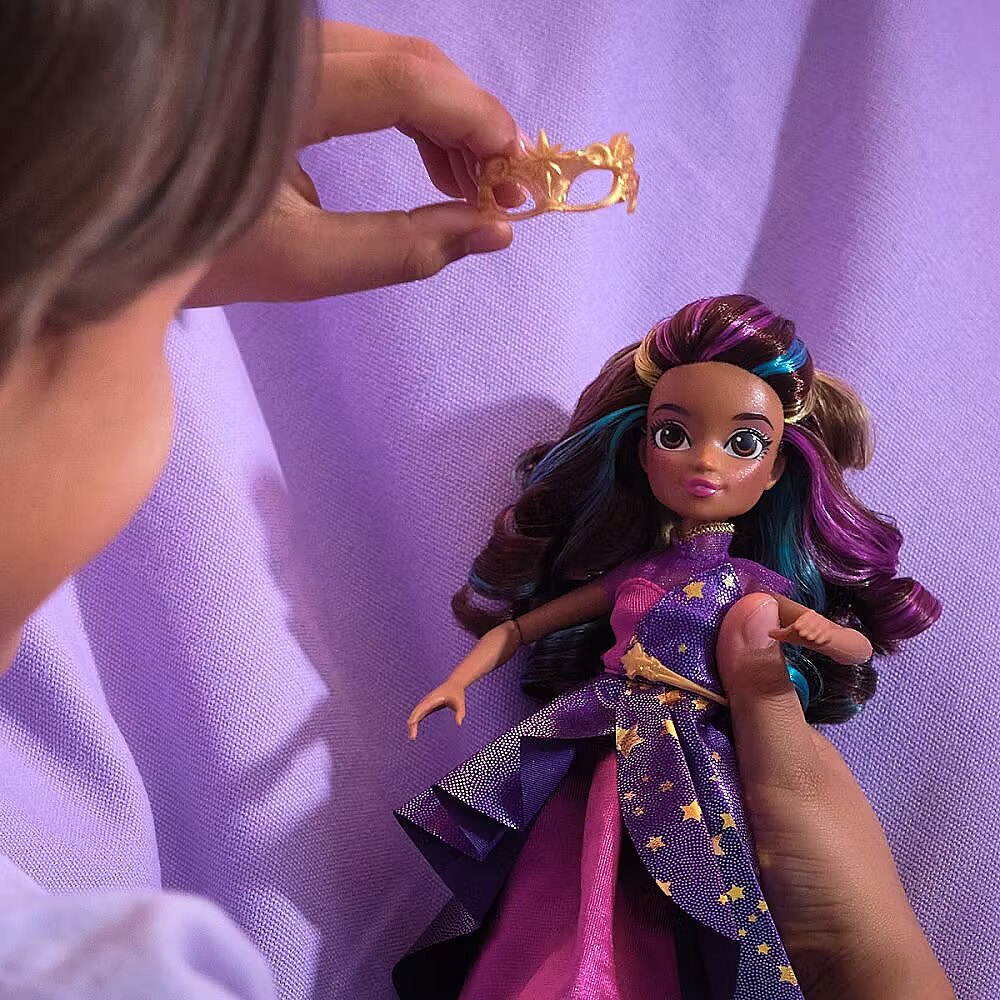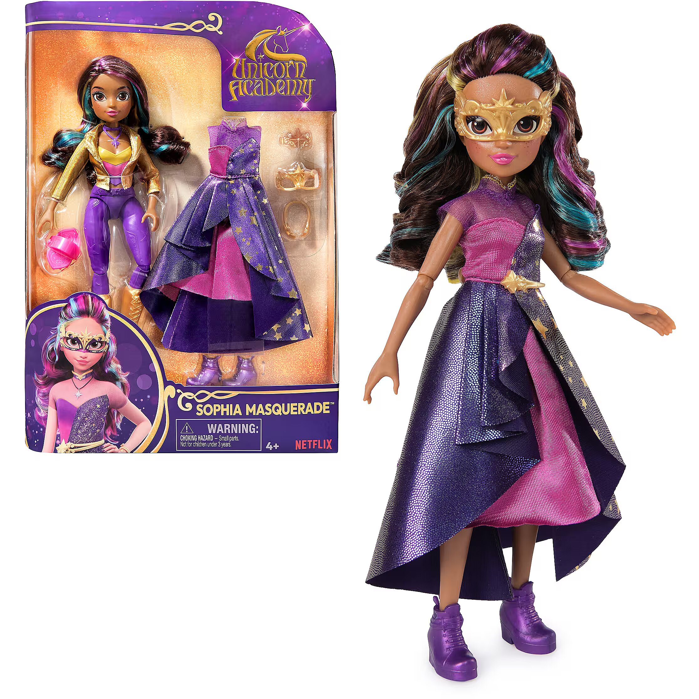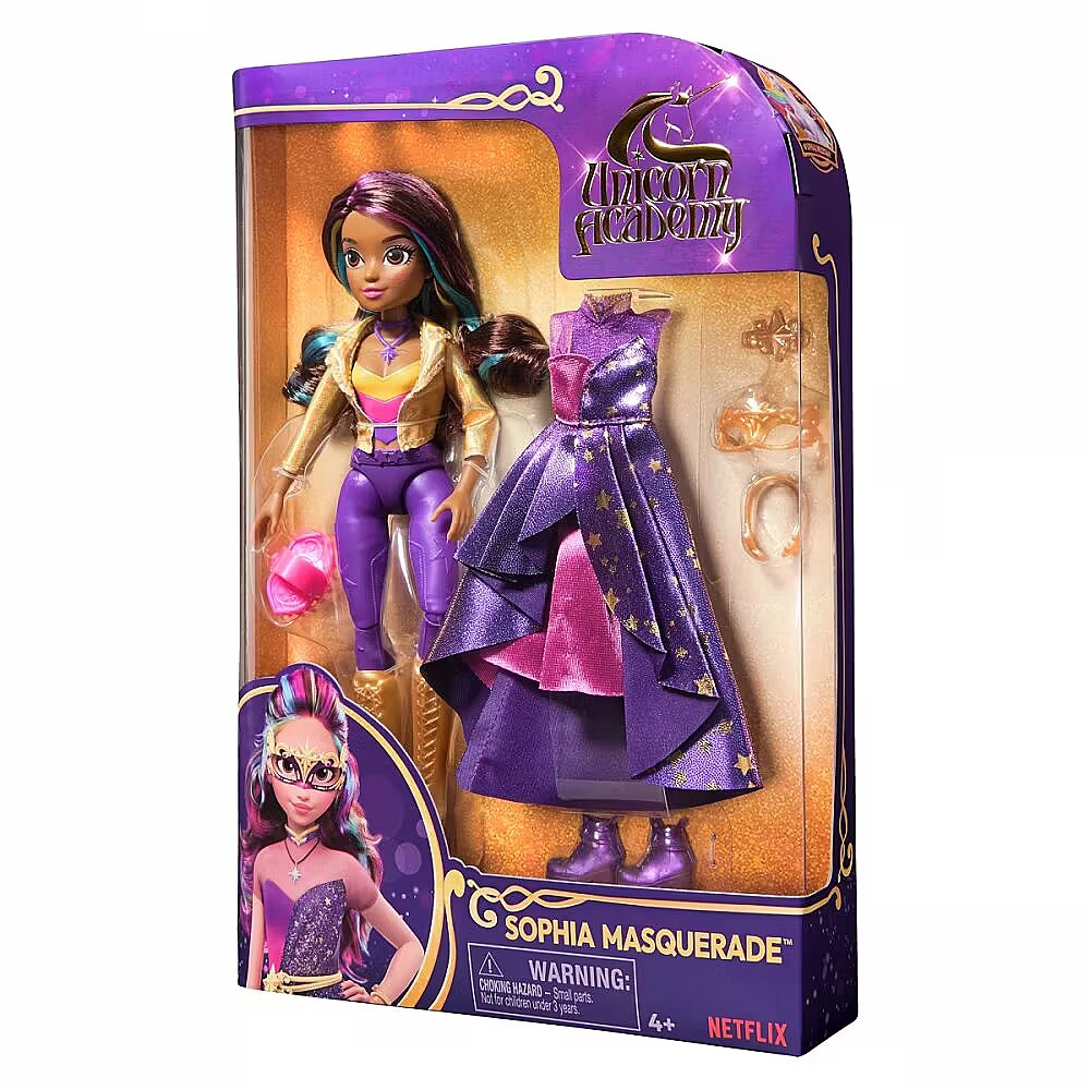 LongDesc - Celebrate the magic of the Fate Faeries at the Unicorn Academy masquerade ball with the Sophia Masquerade doll. Inspired by the NETFLIX animated show and kids books books, this 9.5-inch fashion doll brings Sophia to life. Featuring authentic details and 9 doll accessories, Sophia comes in her riding gear, ready to ride into adventure with her unicorn, Rainbow Light-up Wildstar (sold separately). When it’s time for the ball, switch Sophia from her removable jacket, necklace and boots into her star-print asymmetrical dress, belt, mask, and purple booties. Style her highlighted hair into an updo with the hair tool and hair clip. With 9 points of articulation, pose Sophia as you recreate scenes from the show. For more ways to experience Unicorn Academy with your favorite characters, expand your world with Ava and Isabel dolls and their unicorns, Leaf and River (each sold separately). The magical bonds between Unicorn Academy students and their unicorns will spark endless imaginative storytelling. For kids who enjoy unicorns and horse toys, dolls & accessories, doll house play, collectibles, plush toys and more, Unicorn Academy toys are fun birthday gifts for girls or gifts for any occasion. Bring home the Unicorn Academy deluxe Sophia Masquerade doll.Includes: 1 Doll, 8 Fashion Accessories, 1 Hair Styling Tool